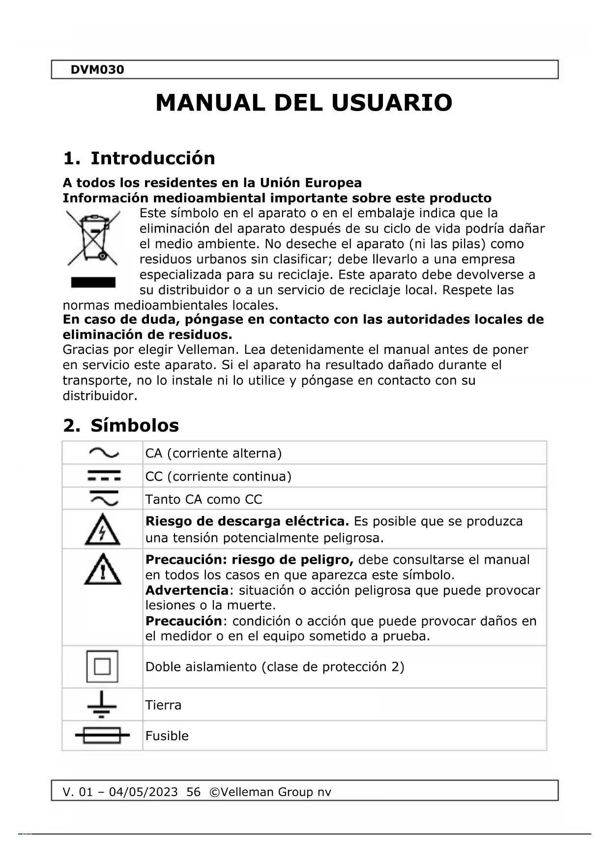 Descarga las instrucciones para tu Multímetro en formato PDF gratis! Encuentra tus instrucciones DVM030 - VELLEMAN y toma tu dispositivo electrónico nuevamente en la mano. En esta página están publicados todos los documentos necesarios para el uso de su dispositivo. DVM030 de la marca VELLEMAN.