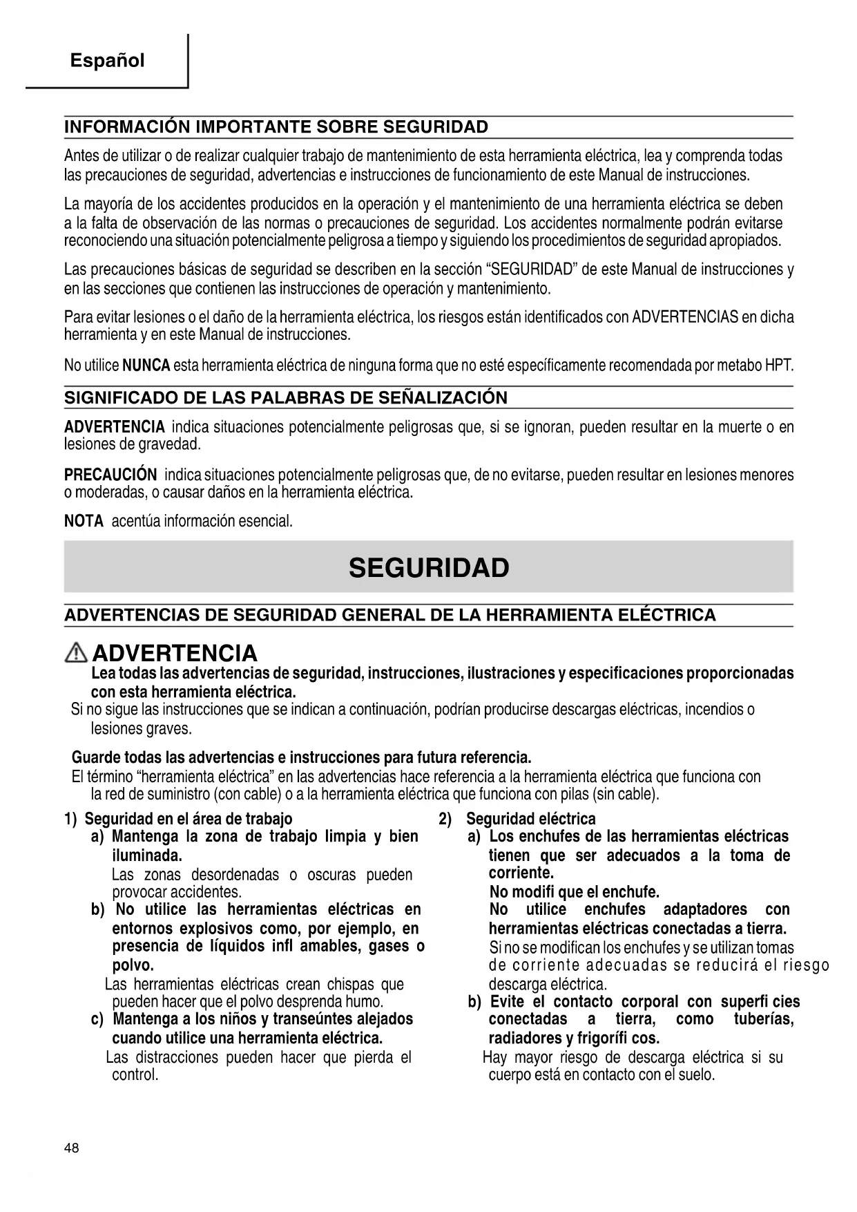 Français 000BookDSDV18DCmetabo.indb47000BookDSDV18DCmetabo.indb47 2022/08/0315:44:532022/08/0315:44:53INFORMACIÓN IMPORTANTE SOBRE SEGURIDAD Antes de utilizar o de realizar cualquier trabajo de mantenimiento de esta herramienta eléctrica, lea y comprenda todas las precauciones de seguridad, advertencias e instrucciones de funcionamiento de este Manual de instrucciones. La mayoría de los accidentes producidos en la operación y el mantenimiento de una herramienta eléctrica se deben a la falta de observación de las normas o precauciones de seguridad. Los accidentes normalmente podrán evitarse reconociendo una situación potencialmente peligrosa a tiempo y siguiendo los procedimientos de seguridad apropiados. Las precauciones básicas de seguridad se describen en la sección “SEGURIDAD” de este Manual de instrucciones y en las secciones que contienen las instrucciones de operación y mantenimiento. Para evitar lesiones o el daño de la herramienta eléctrica, los riesgos están identifi cados con ADVERTENCIAS en dicha herramienta y en este Manual de instrucciones. No utilice NUNCA esta herramienta eléctrica de ninguna forma que no esté específi camente recomendada por metabo HPT. SIGNIFICADO DE LAS PALABRAS DE SEÑALIZACIÓN ADVERTENCIA indica situaciones potencialmente peligrosas que, si se ignoran, pueden resultar en la muerte o en lesiones de gravedad. PRECAUCIÓN indica situaciones potencialmente peligrosas que, de no evitarse, pueden resultar en lesiones menores o moderadas, o causar daños en la herramienta eléctrica. NOTA acentúa información esencial. SEGURIDAD ADVERTENCIAS DE SEGURIDAD GENERAL DE LA HERRAMIENTA ELÉCTRICA ADVERTENCIA Lea todas las advertencias de seguridad, instrucciones, ilustraciones y especifi caciones proporcionadas con esta herramienta eléctrica. Si no sigue las instrucciones que se indican a continuación, podrían producirse descargas eléctricas, incendios o lesiones graves. Guarde todas las advertencias e instrucciones para futura referencia. El término “herramienta eléctrica” en las advertencias hace referencia a la herramienta eléctrica que funciona con la red de suministro (con cable) o a la herramienta eléctrica que funciona con pilas (sin cable).