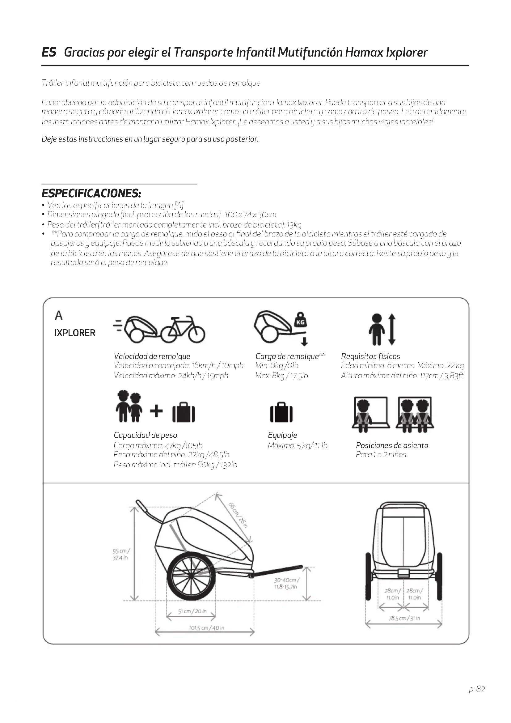 - Praznih baterij ne sežigajte, saj lahko eksplodirajo ali pa pride do puščanja.p. 82 ES Gracias por elegir el Transporte Infantil Mutifunción Hamax Ixplorer Tráiler infantil multifunción para bicicleta con ruedas de remolque Enhorabuena por la adquisición de su transporte infantil multifunción Hamax Ixplorer. Puede transportar a sus hijos de una manera segura y cómoda utilizando el Hamax Ixplorer como un tráiler para bicicleta y como carrito de paseo. Lea detenidamente las instrucciones antes de montar o utilizar Hamax Ixplorer. ¡Le deseamos a usted y a sus hijos muchos viajes increíbles! Deje estas instrucciones en un lugar seguro para su uso posterior. ESPECIFICACIONES: