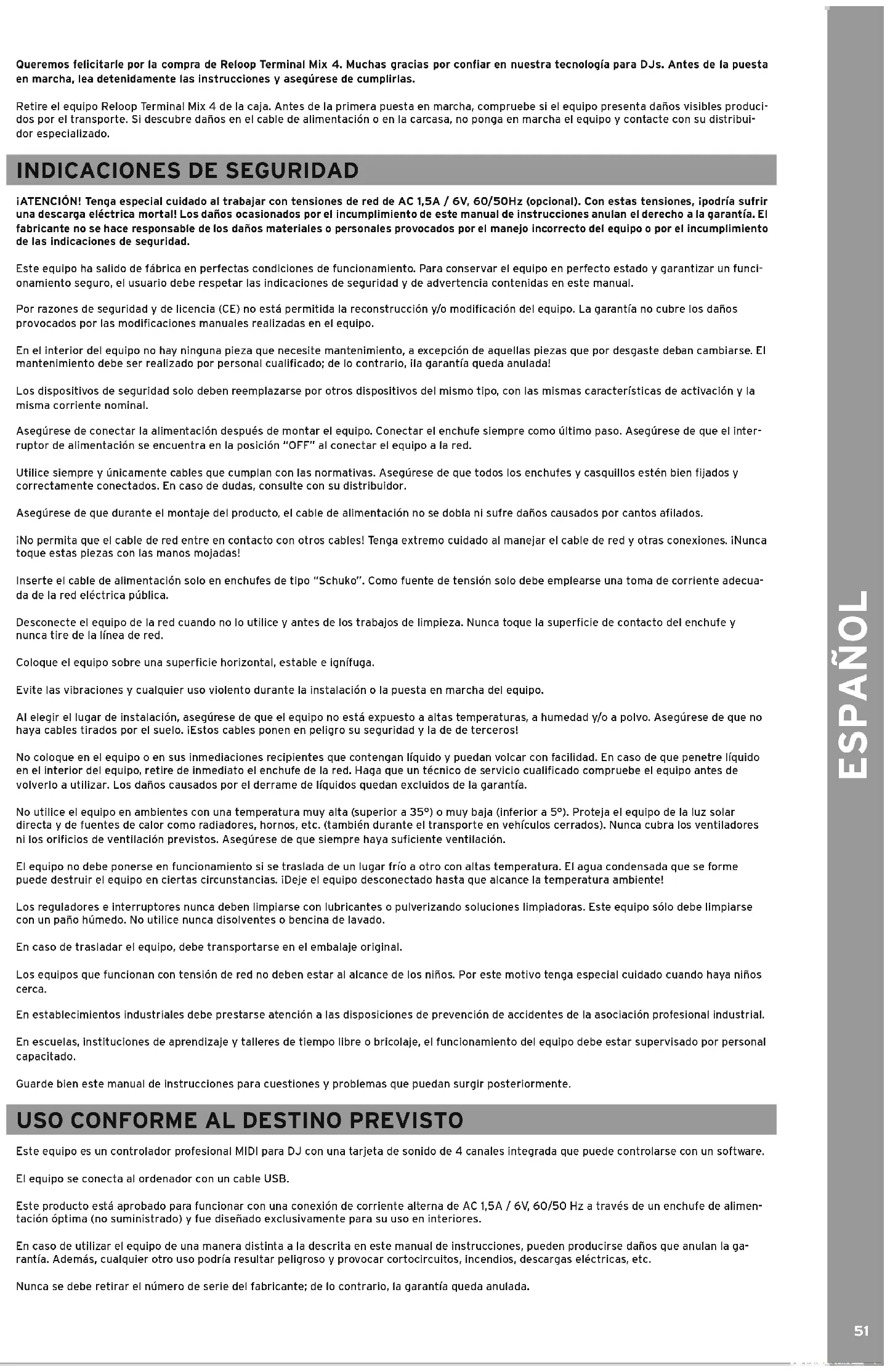 Este equipo ha salido de fábrica en perfectas condiciones de funcionamiento. Para conservar el equipo en perfecto estado y garantizar un funci- onamiento seguro, el usuario debe respetar las indicaciones de seguridad y de advertencia contenidas en este manual. Por razones de seguridad y de licencia (CE) no está permitida la reconstrucción y/o modicación del equipo. La garantía no cubre los daños provocados por las modicaciones manuales realizadas en el equipo. En el interior del equipo no hay ninguna pieza que necesite mantenimiento, a excepción de aquellas piezas que por desgaste deban cambiarse. El mantenimiento debe ser realizado por personal cualicado; de lo contrario, ¡la garantía queda anulada! Los dispositivos de seguridad solo deben reemplazarse por otros dispositivos del mismo tipo, con las mismas características de activación y la misma corriente nominal. Asegúrese de conectar la alimentación después de montar el equipo. Conectar el enchufe siempre como último paso. Asegúrese de que el inter- ruptor de alimentación se encuentra en la posición “OFF” al conectar el equipo a la red. Utilice siempre y únicamente cables que cumplan con las normativas. Asegúrese de que todos los enchufes y casquillos estén bien jados y correctamente conectados. En caso de dudas, consulte con su distribuidor. Asegúrese de que durante el montaje del producto, el cable de alimentación no se dobla ni sufre daños causados por cantos alados. ¡No permita que el cable de red entre en contacto con otros cables! Tenga extremo cuidado al manejar el cable de red y otras conexiones. ¡Nunca toque estas piezas con las manos mojadas! Inserte el cable de alimentación solo en enchufes de tipo “Schuko”. Como fuente de tensión solo debe emplearse una toma de corriente adecua- da de la red eléctrica pública. Desconecte el equipo de la red cuando no lo utilice y antes de los trabajos de limpieza. Nunca toque la supercie de contacto del enchufe y nunca tire de la línea de red. Coloque el equipo sobre una supercie horizontal, estable e ignífuga. Evite las vibraciones y cualquier uso violento durante la instalación o la puesta en marcha del equipo. Al elegir el lugar de instalación, asegúrese de que el equipo no está expuesto a altas temperaturas, a humedad y/o a polvo. Asegúrese de que no haya cables tirados por el suelo. ¡Estos cables ponen en peligro su seguridad y la de de terceros! No coloque en el equipo o en sus inmediaciones recipientes que contengan líquido y puedan volcar con facilidad. En caso de que penetre líquido en el interior del equipo, retire de inmediato el enchufe de la red. Haga que un técnico de servicio cualicado compruebe el equipo antes de volverlo a utilizar. Los daños causados por el derrame de líquidos quedan excluidos de la garantía. No utilice el equipo en ambientes con una temperatura muy alta (superior a 35°) o muy baja (inferior a 5°). Proteja el equipo de la luz solar directa y de fuentes de calor como radiadores, hornos, etc. (también durante el transporte en vehículos cerrados). Nunca cubra los ventiladores ni los oricios de ventilación previstos. Asegúrese de que siempre haya suciente ventilación. El equipo no debe ponerse en funcionamiento si se traslada de un lugar frío a otro con altas temperatura. El agua condensada que se forme puede destruir el equipo en ciertas circunstancias. ¡Deje el equipo desconectado hasta que alcance la temperatura ambiente! Los reguladores e interruptores nunca deben limpiarse con lubricantes o pulverizando soluciones limpiadoras. Este equipo sólo debe limpiarse con un paño húmedo. No utilice nunca disolventes o bencina de lavado. En caso de trasladar el equipo, debe transportarse en el embalaje original. Los equipos que funcionan con tensión de red no deben estar al alcance de los niños. Por este motivo tenga especial cuidado cuando haya niños cerca. En establecimientos industriales debe prestarse atención a las disposiciones de prevención de accidentes de la asociación profesional industrial. En escuelas, instituciones de aprendizaje y talleres de tiempo libre o bricolaje, el funcionamiento del equipo debe estar supervisado por personal capacitado. Guarde bien este manual de instrucciones para cuestiones y problemas que puedan surgir posteriormente. USo CoNfoRmE Al dESTINo pREvISTo Este equipo es un controlador profesional MIDI para DJ con una tarjeta de sonido de 4 canales integrada que puede controlarse con un software. El equipo se conecta al ordenador con un cable USB. Este producto está aprobado para funcionar con una conexión de corriente alterna de AC 1,5A / 6V, 60/50 Hz a través de un enchufe de alimen- tación óptima (no suministrado) y fue diseñado exclusivamente para su uso en interiores. En caso de utilizar el equipo de una manera distinta a la descrita en este manual de instrucciones, pueden producirse daños que anulan la ga- rantía. Además, cualquier otro uso podría resultar peligroso y provocar cortocircuitos, incendios, descargas eléctricas, etc. Nunca se debe retirar el número de serie del fabricante; de lo contrario, la garantía queda anulada.Español