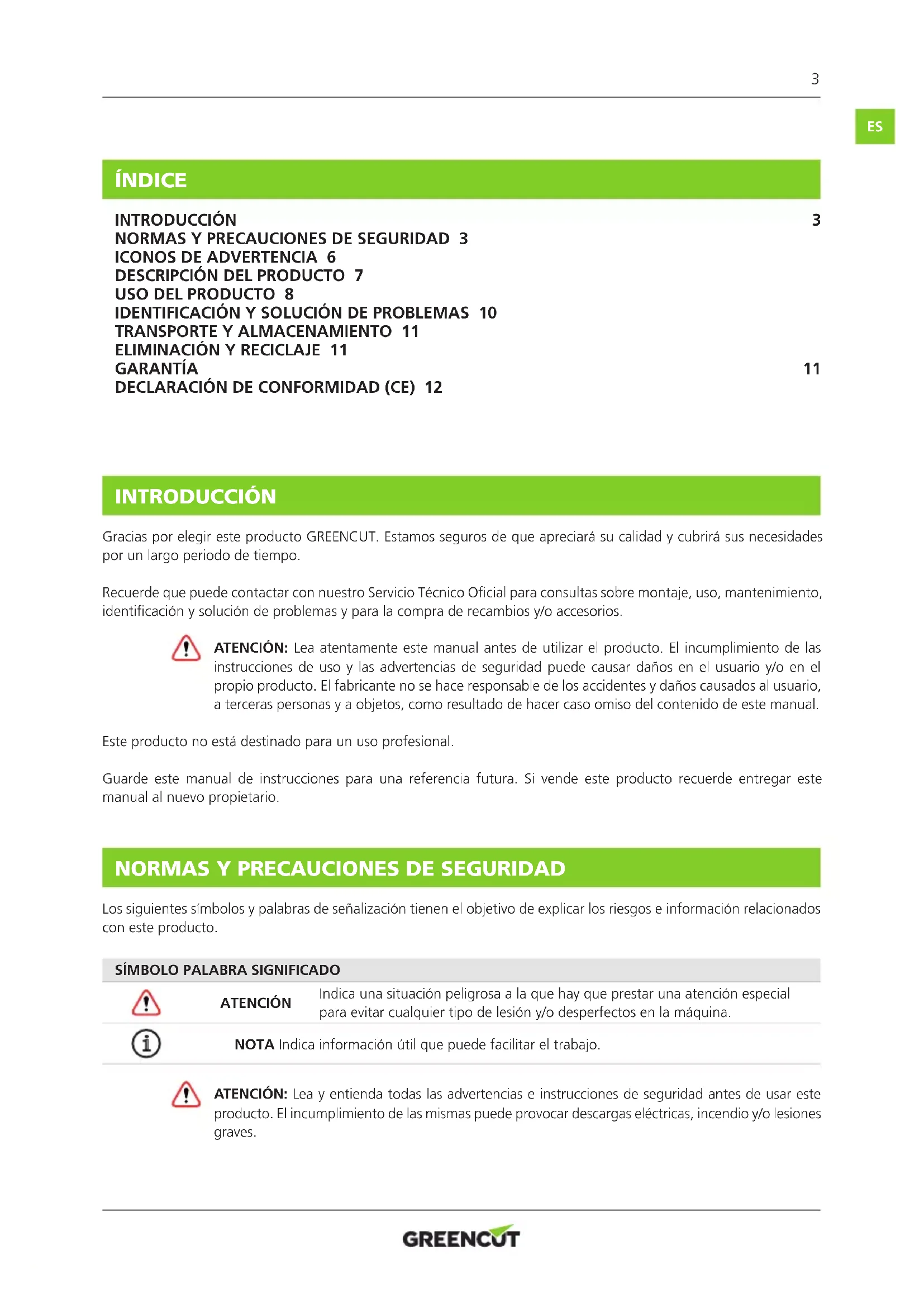 INTRODUCCIÓN Gracias por elegir este producto GREENCUT. Estamos seguros de que apreciará su calidad y cubrirá sus necesidades por un largo periodo de tiempo. Recuerde que puede contactar con nuestro Servicio Técnico Ocial para consultas sobre montaje, uso, mantenimiento, identicación y solución de problemas y para la compra de recambios y/o accesorios. ATENCIÓN: Lea atentamente este manual antes de utilizar el producto. El incumplimiento de las instrucciones de uso y las advertencias de seguridad puede causar daños en el usuario y/o en el propio producto. El fabricante no se hace responsable de los accidentes y daños causados al usuario, a terceras personas y a objetos, como resultado de hacer caso omiso del contenido de este manual. Este producto no está destinado para un uso profesional. Guarde este manual de instrucciones para una referencia futura. Si vende este producto recuerde entregar este manual al nuevo propietario.