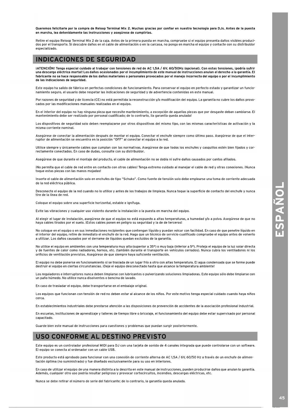 Retire el equipo Reloop Terminal Mix 2 de la caja. Antes de la primera puesta en marcha, compruebe si el equipo presenta daños visibles produci- dos por el transporte. Si descubre daños en el cable de alimentación o en la carcasa, no ponga en marcha el equipo y contacte con su distribuidor especializado. INdICACIoNES dE SEGURIdAd
