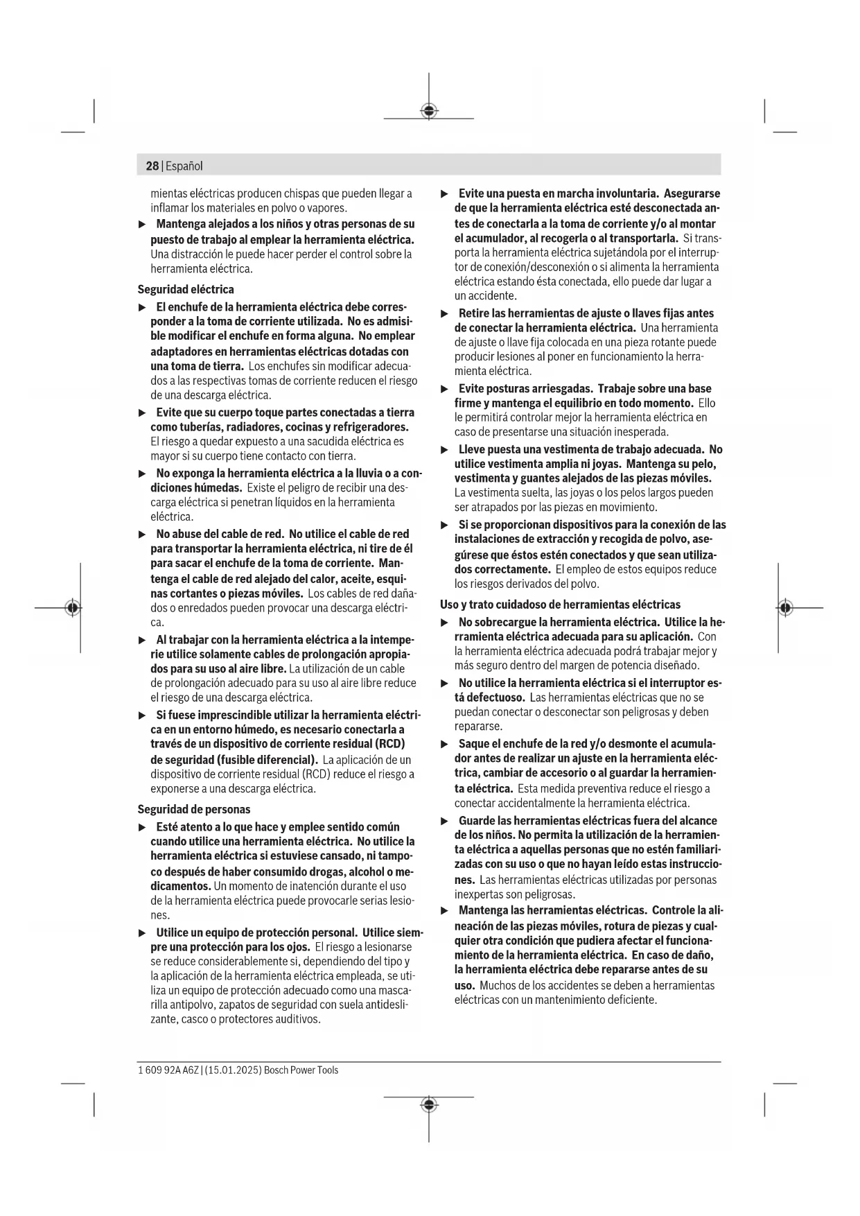 Arrêt en cas de contrecoup En cas de rebond soudain de l’outil électropor- tatif, par ex. blocage lors d'un fraisage, un cir- cuit électronique coupe l’alimentation élec- trique du moteur. Pour remettre en marche l’outil électroportatif, placez l’in- terrupteur Marche/Arrêt(5)/(11) dans la position arrêt et redémarrez l’outil électroportatif. Protection anti-redémarrage La protection anti-redémarrage évite le démarrage incontrô- lé de l’outil électroportatif après une coupure de courant. Pour remettre en marche l’outil électroportatif, placez l’in- terrupteur Marche/Arrêt(5)/(11) dans la position arrêt et redémarrez l’outil électroportatif. Remarque: Le fait de remettre l’outil en marche aussitôt après son arrêt peut activer la protection anti-redémarrage. Dans un tel cas, l’outil électroportatif ne démarre pas bien que l’interrupteur Marche/Arrêt(5)/(11) soit sur Marche. Mettez l’interrupteur Marche/Arrêt(5)/(11) dans la position Arrêt et remettez l’outil électroportatif en marche. Démarrage progressif La fonction démarrage progressif limite le couple lors de la mise en marche et augmente la durée de vie du moteur. Instructions d’utilisation u Débranchez le câble d’alimentation de la prise avant d’effectuer des travaux quels qu’il soient sur l’outil électroportatif. u Protégez les outils abrasifs contre les coups. u Ne provoquez pas l’arrêt de l’outil électroportatif en exerçant une pression trop forte. u Après l’avoir fortement sollicité, laissez tourner l’outil électroportatif à vide pendant quelques minutes pour refroidir l’accessoire de travail. u Les meules deviennent très chaudes pendant leur uti- lisation. Attendez qu’elles aient refroidi avant de les toucher. Pour un résultat optimal, guidez la meule de façon régulière en exerçant une pression modérée. Une pression trop forte réduit la performance de l’outil électroportatif et la meule s’use plus vite. 1 609 92A A6Z | (15.01.2025) Bosch Power ToolsEspañol | 27 Entretien et Service après‑vente Nettoyage et entretien u Débranchez le câble d’alimentation de la prise avant d’effectuer des travaux quels qu’il soient sur l’outil électroportatif. u Toujours tenir propres l’outil électroportatif ainsi que les fentes de ventilation afin d’obtenir un travail im- peccable et sûr. u Dans la mesure du possible, utilisez toujours un aspi- rateur quand les conditions de travail sont extrêmes. Soufflez fréquemment de l’air comprimé au travers des fentes de ventilation et placez un disjoncteur dif- férentiel (PRCD) en amont. Lors du travail des métaux, il est possible que des poussières métalliques à effet conducteur se déposent à l’intérieur de l’outil. La double isolation de l’outil électroportatif risque alors d’être en- dommagée. Stockez et traitez les accessoires avec précaution. Dans le cas où il s’avère nécessaire de remplacer le câble d’alimentation, confiez le remplacement à Bosch ou une sta- tion de Service Après-Vente agréée pour outillage Bosch afin de ne pas compromettre la sécurité. Service après-vente et conseil utilisateurs Notre Service Après-Vente répond à vos questions concer- nant la réparation et l’entretien de votre produit et les pièces de rechange. Des vues éclatées ainsi que des informations concernant les pièces de rechange se trouvent également sous: www.bosch‑pt.com L’équipe de conseil utilisateurs Bosch se tient à votre dispo- sition pour répondre à vos questions concernant nos pro- duits et leurs accessoires. Pour toute demande de renseignement ou commande de pièces de rechange, nous préciser impérativement le numé- ro d’article à dix chiffres indiqué sur la plaque signalétique du produit. France Réparer un outil Bosch n’a jamais été aussi simple, et ce, en moins de 5 jours, grâce à SAV DIRECT, notre formulaire de retour en ligne que vous trouverez sur notre site internet www.bosch-pt.fr à la rubrique Services. Vous y trouverez également notre boutique de pièces détachées en ligne où vous pouvez passer directement vos commandes. Vous êtes un utilisateur, contactez : Le Service Clientèle Bosch Outillage Electroportatif Tel.: 0970821226 (Numéro non surtaxé au prix d'un ap- pel local) E-Mail: sav.outillage-electroportatif@fr.bosch.com Vous êtes un revendeur, contactez: Robert Bosch (France) S.A.S. Service Après-Vente Electroportatif 126, rue de Stalingrad 93705 DRANCY Cédex Tel.: (01) 43119006 E-Mail: sav-bosch.outillage@fr.bosch.com Vous trouverez d’autres adresses de service sous: www.bosch-pt.com/serviceaddresses Élimination des déchets Les outils électroportatifs, ainsi que leurs accessoires et em- ballages, doivent pouvoir suivre chacun une voie de recy- clage appropriée. Ne jetez pas les outils électroportatifs avec les ordures ménagères! Seulement pour les pays de l’UE : Les outils électroportatifs usagés doivent être mis au rebut séparément. Utilisez les systèmes de collecte prévus. S’ils ne sont pas éliminés correctement, les déchets d’équi- pements électriques et électroniques peuvent avoir des ef- fets néfastes sur l’environnement et la santé humaine en rai- son de la présence éventuelle de substances dangereuses. Valable uniquement pour la France: Español Indicaciones de seguridad Advertencias de peligro generales para herramientas eléctricas ADVERTEN- CIA Lea íntegramente estas adverten- cias de peligro e instrucciones. En caso de no atenerse a las adverten- cias de peligro e instrucciones siguientes, ello puede ocasio- nar una descarga eléctrica, un incendio y/o lesión grave. Guardar todas las advertencias de peligro e instruccio- nes para futuras consultas. El término "herramienta eléctrica" empleado en las siguien- tes advertencias de peligro se refiere a herramientas eléctri- cas de conexión a la red (con cable de red) y a herramientas eléctric