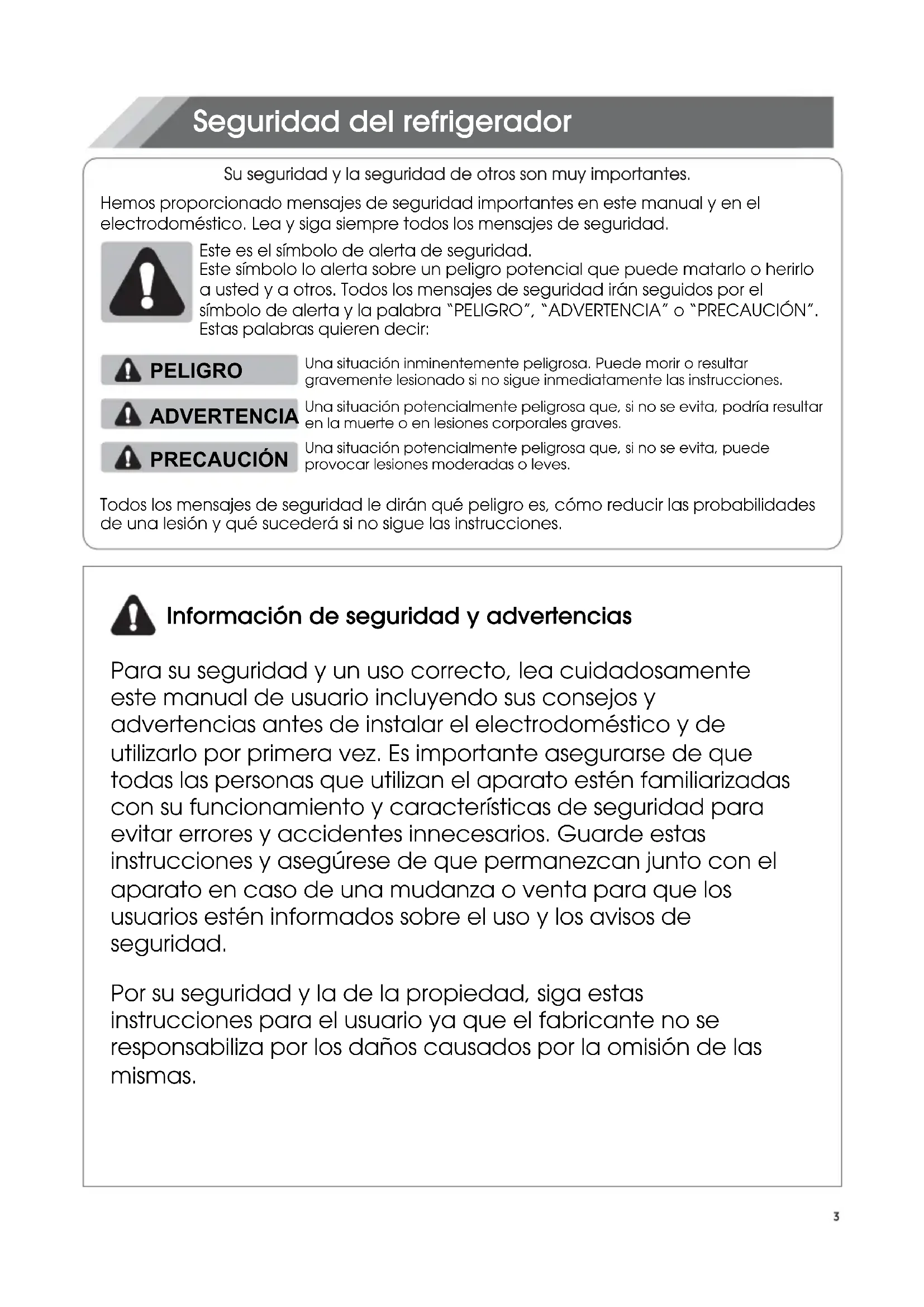 29Su seguridad y la seguridad de otros son muy importantes. Seguridad del refrigerador Hemos proporcionado mensajes de seguridad importantes en este manual y en el electrodoméstico. Lea y siga siempre todos los mensajes de seguridad. Todos los mensajes de seguridad le dirán qué peligro es, cómo reducir las probabilidades de una lesión y qué sucederá si no sigue las instrucciones. Para su seguridad y un uso correcto, lea cuidadosamente este manual de usuario incluyendo sus consejos y advertencias antes de instalar el electrodoméstico y de utilizarlo por primera vez. Es importante asegurarse de que todas las personas que utilizan el aparato estén familiarizadas con su funcionamiento y características de seguridad para evitar errores y accidentes innecesarios. Guarde estas instrucciones y asegúrese de que permanezcan junto con el aparato en caso de una mudanza o venta para que los usuarios estén informados sobre el uso y los avisos de seguridad. Por su seguridad y la de la propiedad, siga estas instrucciones para el usuario ya que el fabricante no se responsabiliza por los daños causados por la omisión de las mismas. Información de seguridad y advertencias Este es el símbolo de alerta de seguridad. Este símbolo lo alerta sobre un peligro potencial que puede matarlo o herirlo a usted y a otros. Todos los mensajes de seguridad irán seguidos por el símbolo de alerta y la palabra “PELIGRO”, “ADVERTENCIA” o “PRECAUCIÓN”. Estas palabras quieren decir: Una situación inminentemente peligrosa. Puede morir o resultar gravemente lesionado si no sigue inmediatamente las instrucciones. Una situación potencialmente peligrosa que, si no se evita, podría resultar en la muerte o en lesiones corporales graves. Una situación potencialmente peligrosa que, si no se evita, puede provocar lesiones moderadas o leves. PELIGRO ADVERTENCIA PRECAUCIÓNSeguridad para niños y personas vulnerables Conforme a las normas EN Este electrodoméstico puede ser utilizado por menores de 8 años en adelante y por personas con capacidades físicas, sensoriales o mentales reducidas o falta de experiencia o conocimiento sólo si han sido supervisados o instruidos sobre el uso del electrodoméstico en una forma segura y hayan entendido los peligros que incluye. Los niños no deben jugar con el aparato. La limpieza y el mantenimiento no deben realizarlos niños sin supervisión. Los niños de 3 a 8 años tienen permitido cargar y descargar electrodomésticos de refrigeración. Conforme a las normas IEC Este aparato no ha sido diseñado para que lo utilicen personas (incluidos niños) con capacidades físicas, sensoriales o mentales reducidas, o con falta de experiencia o conocimientos, a menos que estén supervisados o reciban instrucciones acerca del uso del aparato por parte de una persona responsable de su seguridad. Los niños deben estar supervisados para garantizar que no jueguen con el aparato. Mantenga el material de empaque lejos del alcance de los niños ya que existe riesgo de sofocación. Si va a descartar el electrodoméstico, quite el conector del tomacorriente, corte el cable de conexión (lo más cerca que pueda del electrodoméstico) y quite la puerta para evitar que hayan descargas eléctricas o que los niños queden encerrados dentro del electrodoméstico. Si este aparato, con sellos magnéticos en la puerta, es para reemplazar un aparato viejo con cerradura de resorte (pestillo) en la puerta o en la tapa, asegúrese de que la cerradura no se pueda utilizar antes de descartar el aparato viejo. Así evitará que sea una trampa mortal para los niños.Seguridad general Este aparato está diseñado para ser utilizado en el hogar y las aplicaciones similares tales como: - áreas de cocinas de personal en tiendas, oficinas y otros entornos de trabajo; - granjas y para clientes en hoteles, moteles y otro tipo residencial; - entornos para huéspedes; - aplicaciones de restauración y no minoristas similares. No almacene las sustancias explosivas tales como latas de aerosol con un propulsor inflamable en este aparato. Si el cable de alimentación está dañado, deberá ser reemplazado por el fabricante, su agente de o las personas similarmente cualificadas con el fin de evitar un peligro. ADVERTENCIA — Mantenga las aberturas de ventilación, en la carcasa del electrodoméstico o en la estructura incorporada, libre de obstrucciones. ADVERTENCIA — No utilice dispositivos mecánicos ni otros medios, a menos que sean recomendados por el fabricante, para acelerar el proceso de descongelación. ADVERTENCIA — No dañe el circuito refrigerante. ADVERTENCIA — No utilice aparatos eléctricos, a menos que sean del tipo recomendado por el fabricante, dentro de los compartimientos de almacenamiento de alimentos del aparato. El refrigerante y el gas del aislante son inflamables. Al desechar el electrodoméstico, hágalo únicamente en el centro de eliminación de residuos autorizado. No lo expongan a llamas. ADVERTENCIA — Al momento de colocar el aparato, asegúrese de que el cable de alimentación no esté atrapado ni dañado. ADVERTENCIA — Llene el recipiente de agua solo con agua potable.ADVERTENCIA — No coloque múltiples tomas portátiles ni fuentes de alimentación portátiles en la parte trasera del aparato. Sustituir el LED Refrigerante Advertencia: Riesgo de incendio/materiales inflamables ADVERTENCIA — ¡El usuario no debe sustituir la luz LED! Si la luz LED se daña, contacte a la línea de atención al cliente para una asistencia. El refrigerante isobutano (R600a) se encuentra dentro del circuito refrigerante del electrodoméstico; es un gas natural con un nivel alto de compatibilidad ambiental, no obstante es inflamable. Asegúrese de que ningún componente del circuito refrigerante se haya dañado durante el traslado y la instalación del aparato. ADVERTENCIA — Los refrigeradores contienen refrigerante y gases en el aislamiento. El refrigerador y los gases tienen que ser