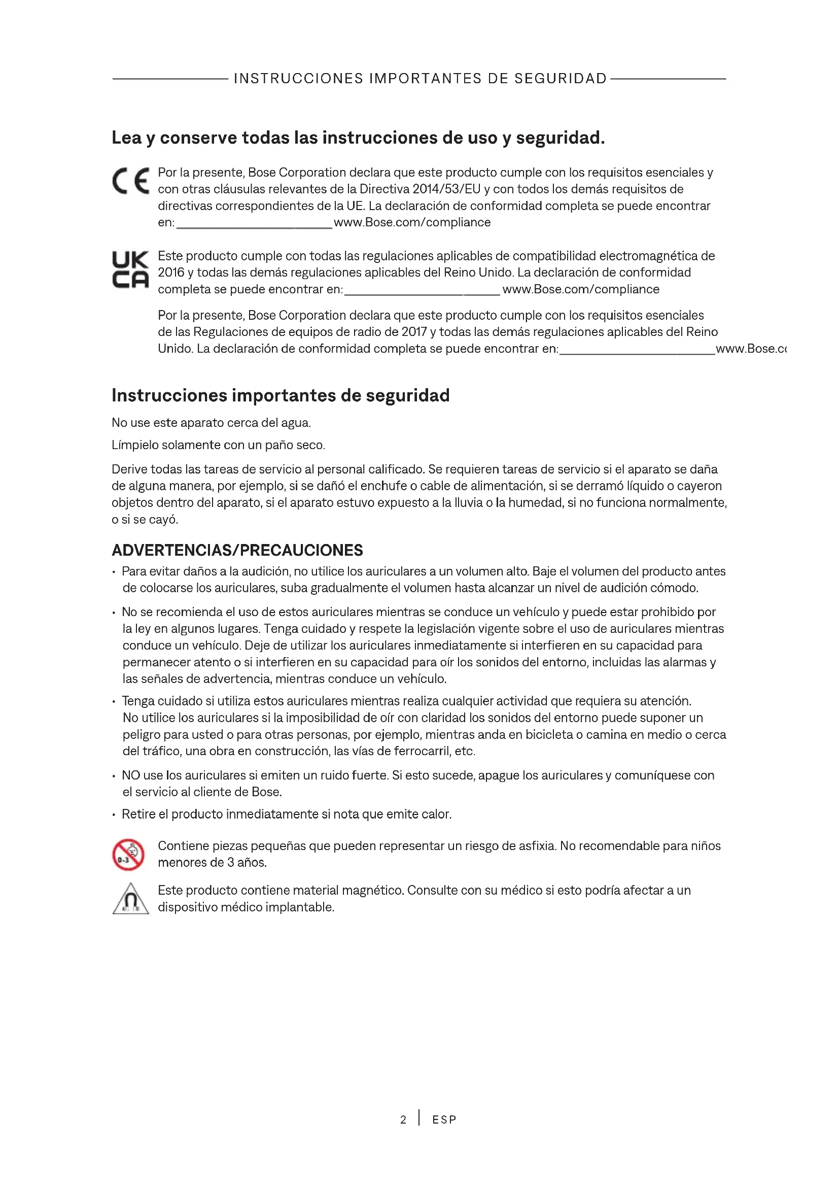 ESP Lea y conserve todas las instrucciones de uso y seguridad. Por la presente, Bose Corporation declara que este producto cumple con los requisitos esenciales y con otras cláusulas relevantes de la Directiva 2014/53/EU y con todos los demás requisitos de directivas correspondientes de la UE. La declaración de conformidad completa se puede encontrar en: www.Bose.com/compliancewww.Bose.com/compliance Este producto cumple con todas las regulaciones aplicables de compatibilidad electromagnética de 2016 y todas las demás regulaciones aplicables del Reino Unido. La declaración de conformidad completa se puede encontrar en: www.Bose.com/compliancewww.Bose.com/compliance Por la presente, Bose Corporation declara que este producto cumple con los requisitos esenciales de las Regulaciones de equipos de radio de 2017 y todas las demás regulaciones aplicables del Reino Unido. La declaración de conformidad completa se puede encontrar en: www.Bose.com/compliancewww.Bose.com/compliance Instrucciones importantes de seguridad No use este aparato cerca del agua. Límpielo solamente con un paño seco. Derive todas las tareas de servicio al personal calificado. Se requieren tareas de servicio si el aparato se daña de alguna manera, por ejemplo, si se dañó el enchufe o cable de alimentación, si se derramó líquido o cayeron objetos dentro del aparato, si el aparato estuvo expuesto a la lluvia o la humedad, si no funciona normalmente, o si se cayó. ADVERTENCIAS/PRECAUCIONES