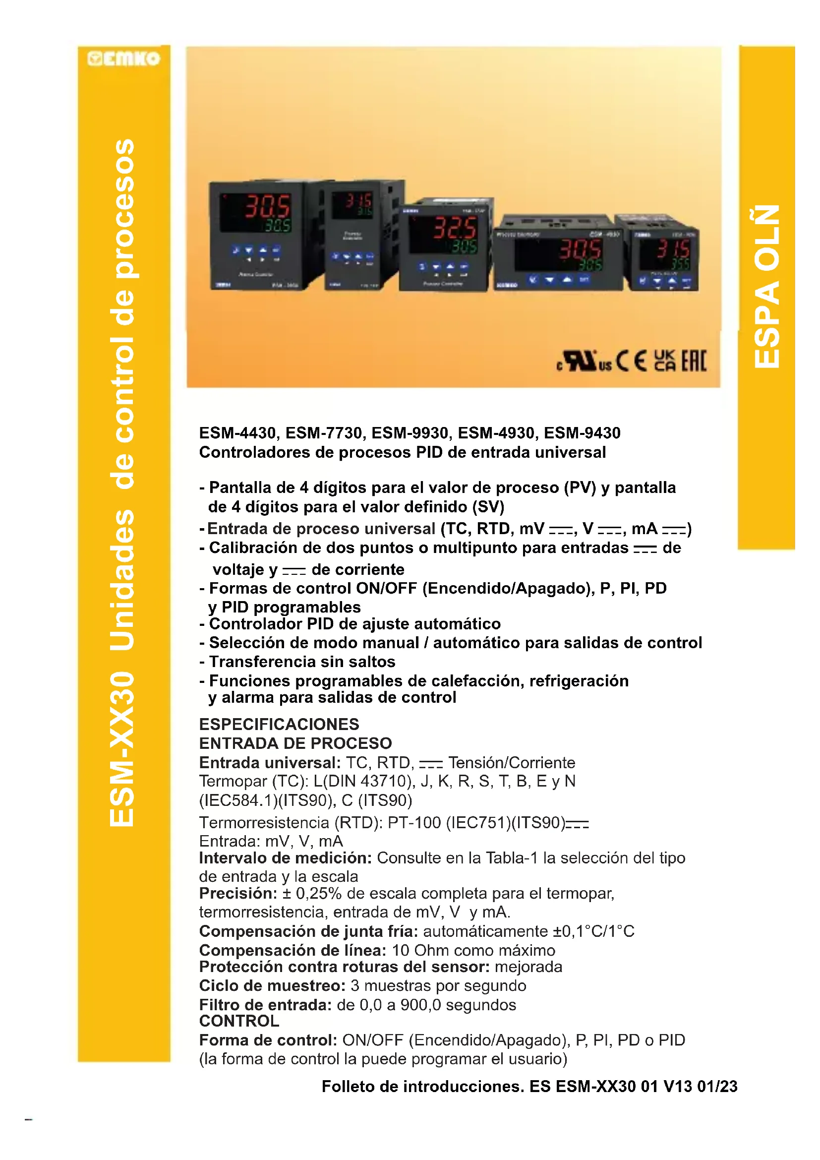 - Formas de control ON/OFF (Encendido/Apagado), P, PI, PD y PID programables Entrada de proceso universal (TC, RTD, mV Z, V Z, mA Z) - Calibración de dos puntos o multipunto para entradas Z de voltaje y Z de corriente - Controlador PID de ajuste automático - Selección de modo manual / automático para salidas de control - Transferencia sin saltos - Funciones programables de calefacción, refrigeración y alarma para salidas de control ESPA OLÑ Folleto de introducciones. ES ESM-XX30 01 V13 01/23PANTALLA Pantalla de proceso: ESM-4430: Pantalla LED 10,1 mm roja de 4 dígitos ESM-4930: Pantalla LED 13,2 mm roja de 4 dígitos ESM-7730: Pantalla LED 13,2 mm roja de 4 dígitos ESM-9930: Pantalla LED 19 mm roja de 4 dígitos ESM-9430: Pantalla LED 10,1 mm roja de 4 dígitos Pantalla del valor definido: ESM-4430: Pantalla LED 8 mm verde de 4 dígitos ESM-4930: Pantalla LED 8 mm verde de 4 dígitos ESM-7730: Pantalla LED 9,1 mm verde de 4 dígitos ESM-9930: Pantalla LED 10,8 mm verde de 4 dígitos ESM-9430: Pantalla LED 8 mm verde de 4 dígitos LEDS : AT(Ajuste automático), M (Modo manual), A (Modo automático), Led PSET / ASET1 / ASET2 (Ajuste de control o de alarma), led PO, AO1, AO2 (Estado de control o de la alarma) °C / °F / V SALIDA Salidas de relé estándar: Dos relés. 5 A @ 250 VV (en la carga resistiva) (Se pueden programar como Salida de control o de alarma) Salida de la unidad de control del SSR: Máximo 17 mA , máx. 25 V Z