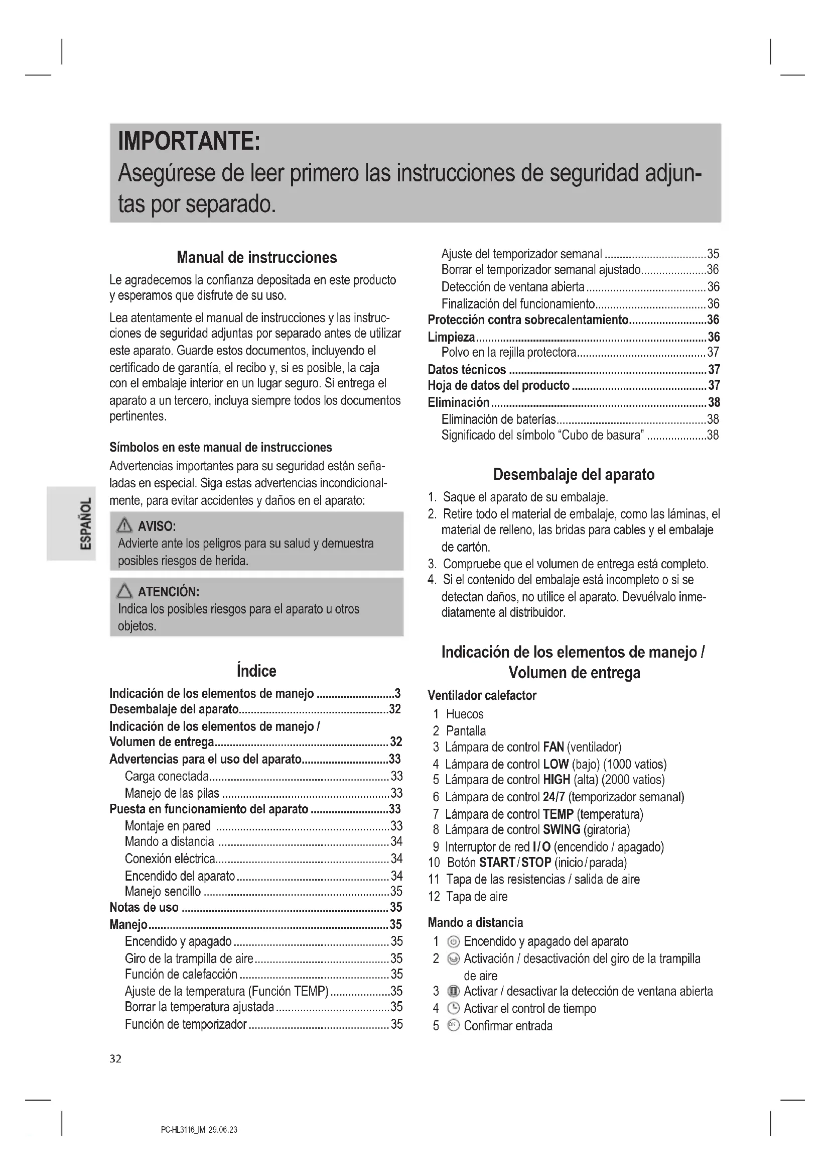 - Indicación de los elementos de manejo / Volumen de entrega p. 32