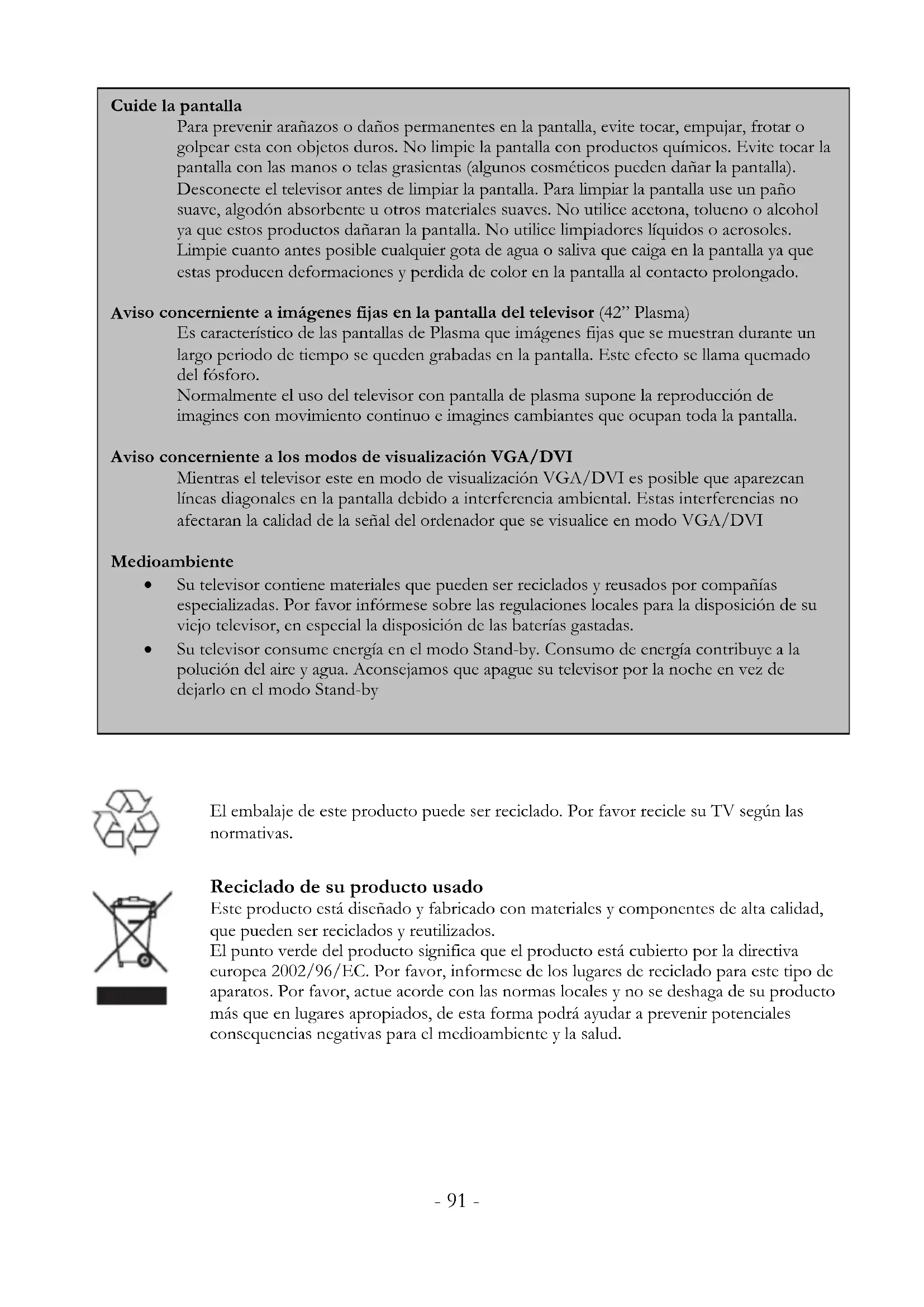 - 89 -- 90 -Cuide la pantalla Para prevenir arañazos o daños permanentes en la pantalla, evite tocar, empujar, frotar o golpear esta con objetos duros. No limpie la pantalla con productos químicos. Evite tocar la pantalla con las manos o telas grasientas (algunos cosméticos pueden dañar la pantalla). Desconecte el televisor antes de limpiar la pantalla. Para limpiar la pantalla use un paño suave, algodón absorbente u otros materiales suaves. No utilice acetona, tolueno o alcohol ya que estos productos dañaran la pantalla. No utilice limpiadores líquidos o aerosoles. Limpie cuanto antes posible cualquier gota de agua o saliva que caiga en la pantalla ya que estas producen deformaciones y perdida de color en la pantalla al contacto prolongado.