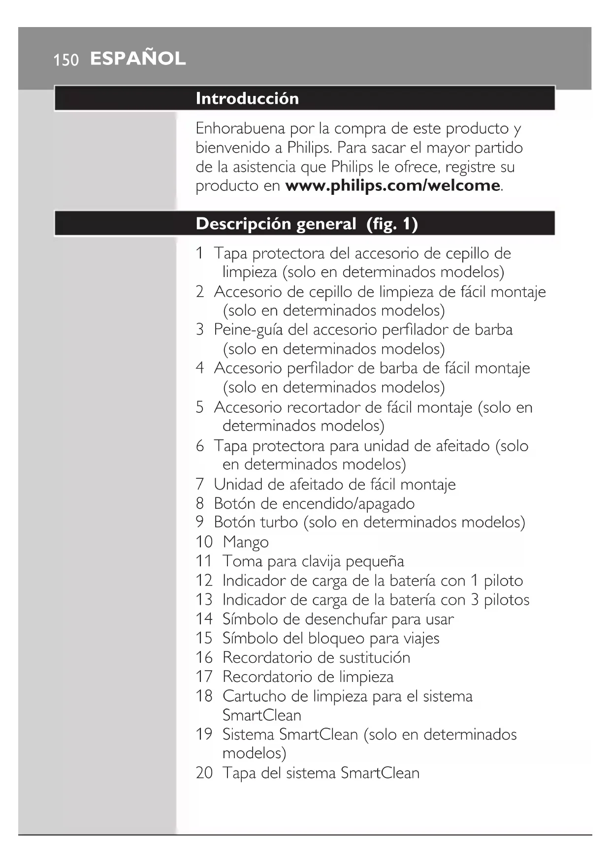 ΕΛΛΗΝΙΚΑ 149150 Introducción Enhorabuena por la compra de este producto y bienvenido a Philips. Para sacar el mayor partido de la asistencia que Philips le ofrece, registre su producto en www.philips.com/welcome. Descripción general (g. 1) 1 Tapa protectora del accesorio de cepillo de limpieza (solo en determinados modelos) 2 Accesorio de cepillo de limpieza de fácil montaje (solo en determinados modelos) 3 Peine-guía del accesorio perlador de barba (solo en determinados modelos) 4 Accesorio perlador de barba de fácil montaje (solo en determinados modelos) 5 Accesorio recortador de fácil montaje (solo en determinados modelos) 6 Tapa protectora para unidad de afeitado (solo en determinados modelos) 7 Unidad de afeitado de fácil montaje 8 Botón de encendido/apagado 9 Botón turbo (solo en determinados modelos) 10 Mango 11 Toma para clavija pequeña 12 Indicador de carga de la batería con 1 piloto 13 Indicador de carga de la batería con 3 pilotos 14 Símbolo de desenchufar para usar 15 Símbolo del bloqueo para viajes 16 Recordatorio de sustitución 17 Recordatorio de limpieza 18 Cartucho de limpieza para el sistema SmartClean 19 Sistema SmartClean (solo en determinados modelos) 20 Tapa del sistema SmartClean ESPAÑOL21 Botón de encendido/apagado 22 Símbolo de la batería 23 Símbolo de limpieza 24 Símbolo de sustitución 25 Símbolo indicador de listo 26 Adaptador de corriente 27 Clavija pequeña 28 Funda (solo en determinados modelos) Nota: Los accesorios suministrados pueden variar según el producto. La caja muestra los accesorios que se han suministrado con el aparato. Información de seguridad importante Antes de usar el aparato, lea atentamente esta información importante y consérvela por si necesitara consultarla en el futuro. Los accesorios suministrados pueden variar según el producto. Peligro - Mantenga el adaptador seco. Advertencia - El adaptador incorpora un transformador. No corte el adaptador para sustituirlo por otra clavija, ya que podría provocar situaciones de peligro. - Este aparato puede ser usado por niños a partir de 8 años y por personas con su capacidad física, psíquica o sensorial reducida y por quienes no tengan los conocimientos y la experiencia necesarios, si han sido supervisados o instruidos acerca del uso del aparato de forma segura y siempre que sepan los riesgos que conlleva su uso. No permita que los niños jueguen con el aparato. Los niños no deben llevar a cabo la limpieza ni el mantenimiento a menos que sean supervisados. - Desenchufe siempre la afeitadora antes de limpiarla bajo el grifo. ESPAÑOL 151- Compruebe siempre el aparato antes de utilizarlo. No utilice el aparato si está dañado, ya que podría ocasionar lesiones. Sustituya siempre una pieza dañada por una del modelo original. Precaución - No sumerja nunca el sistema de limpieza ni el soporte de carga en agua ni los enjuague bajo el grifo. - No utilice nunca agua a una temperatura superior a 80 °C para enjuagar la afeitadora. - Utilice este aparato solo para el uso al que está destinado como se indica en el manual de usuario. - Por razones de higiene, el aparato debería ser usado únicamente por una persona. - No enchufe el adaptador a tomas de corriente eléctrica que tengan un ambientador conectado o que lo hayan tenido para evitar daños irreparables en el adaptador. - No utilice nunca aire comprimido, estropajos, agentes abrasivos ni líquidos agresivos, como gasolina o acetona, para limpiar el aparato. - Si la afeitadora está equipada con un sistema de limpieza, utilice siempre el líquido limpiador original de Philips (cartucho o botella, dependiendo del tipo de sistema de limpieza). - Coloque siempre el sistema de limpieza sobre una supercie horizontal, plana y estable para evitar que el líquido se derrame. - Si el sistema de limpieza utiliza un cartucho de limpieza, asegúrese siempre de que el compartimento del cartucho está cerrado antes de utilizar el sistema de limpieza para limpiar o cargar la afeitadora. - Cuando el sistema de limpieza esté listo parar usar, no lo mueva para evitar que el líquido limpiador se derrame. ESPAÑOL152- Cuando enjuague la afeitadora es posible que salga agua por el oricio de su parte inferior. Esto es normal y no es peligroso, ya que todos los sistemas electrónicos están dentro de una unidad motora hermética en el interior de la afeitadora. Campos electromagnéticos (CEM) - Este aparato de Philips cumple los estándares y las normativas aplicables sobre exposición a campos electromagnéticos. General - Esta afeitadora es resistente al agua. Se puede utilizar en la bañera o en la ducha y se puede limpiar bajo el grifo. Por tanto, la afeitadora solo puede utilizarse sin cable por motivos de seguridad. - Este aparato es adecuado para voltajes de red de 100 a 240 voltios. - El adaptador transforma la corriente de