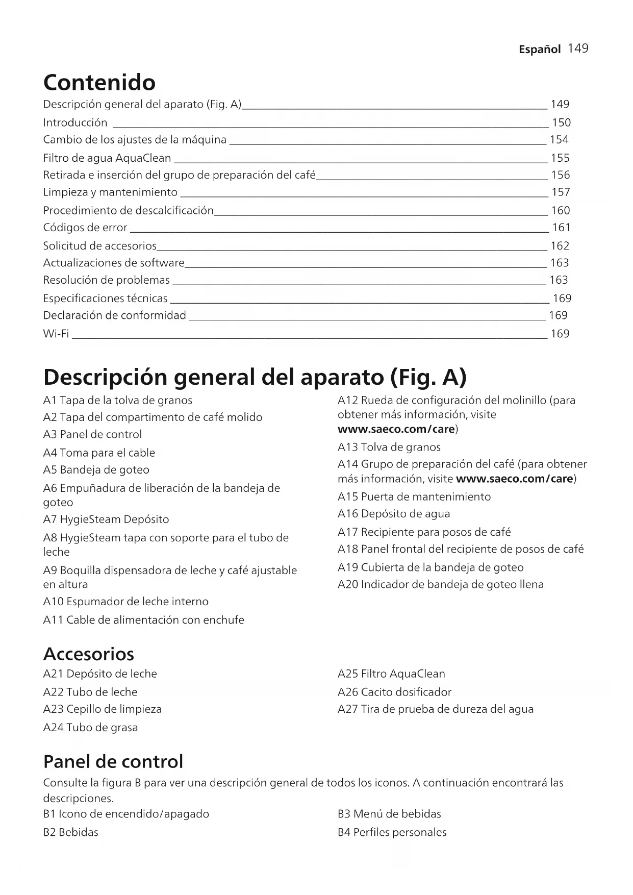 Español Contenido Descripción general del aparato (Fig. A)______________________________________________________ 149 Introducción _____________________________________________________________________________ 150 Cambio de los ajustes de la máquina ________________________________________________________ 154 Filtro de agua AquaClean __________________________________________________________________ 155 Retirada e inserción del grupo de preparación del café_________________________________________ 156 Limpieza y mantenimiento _________________________________________________________________ 157 Procedimiento de descalcificación___________________________________________________________ 160 Códigos de error __________________________________________________________________________ 161 Solicitud de accesorios_____________________________________________________________________ 162 Actualizaciones de software________________________________________________________________ 163 Resolución de problemas __________________________________________________________________ 163 Especificaciones técnicas ___________________________________________________________________ 169 Declaración de conformidad _______________________________________________________________ 169 Wi-Fi ____________________________________________________________________________________ 169 Descripción general del aparato (Fig. A) A1 Tapa de la tolva de granos A2 Tapa del compartimento de café molido A3 Panel de control A4 Toma para el cable A5 Bandeja de goteo A6 Empuñadura de liberación de la bandeja de goteo A7 HygieSteam Depósito A8 HygieSteam tapa con soporte para el tubo de leche A9 Boquilla dispensadora de leche y café ajustable en altura A10 Espumador de leche interno A11 Cable de alimentación con enchufe A12 Rueda de configuración del molinillo (para obtener más información, visite www.saeco.com/care) A13 Tolva de granos A14 Grupo de preparación del café (para obtener más información, visite www.saeco.com/care) A15 Puerta de mantenimiento A16 Depósito de agua A17 Recipiente para posos de café A18 Panel frontal del recipiente de posos de café A19 Cubierta de la bandeja de goteo A20 Indicador de bandeja de goteo llena Accesorios A21 Depósito de leche A22 Tubo de leche A23 Cepillo de limpieza A24 Tubo de grasa A25 Filtro AquaClean A26 Cacito dosificador A27 Tira de prueba de dureza del agua Panel de control Consulte la figura B para ver una descripción general de todos los iconos. A continuación encontrará las descripciones. B1 Icono de encendido/apagado B2 Bebidas B3 Menú de bebidas B4 Perfiles personales150 Español B5 Configuración de la máquina B6 Menú de estados B7 Tienda B8 Icono de inicio/parada Introducción Enhorabuena por la adquisición de una cafetera totalmente automática Saeco. Para disfrutar de todas las ventajas que ofrece la asistencia en línea de Saeco, utilice el panel de control para registrar su máquina mediante la conexión Wi-Fi integrada o bien vaya a www.saeco.com/MyCoffeeMachine y registre su producto allí. Lea atentamente el librillo de seguridad separado antes de usar la máquina por primera vez y consérvelo por si necesitara consultarlo en el futuro. La cafetera totalmente automática Saeco le permite conectarse a la red Wi-Fi para mejorar su experiencia al disfrutar del café. Al conectar su máquina a la red Wi-Fi, podrá: