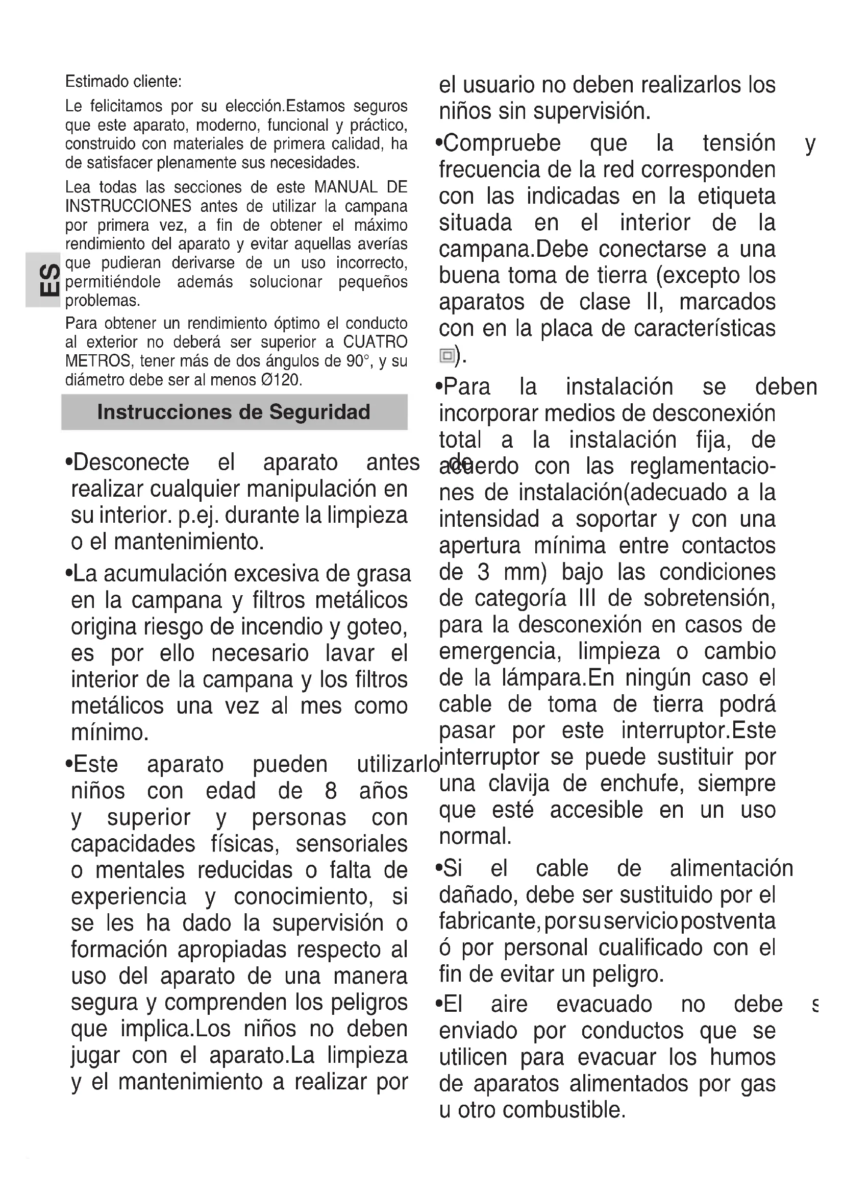 - Enrosqueelembellecedordelportalámparas. Cambio de Luces Limpieza y Manteniemiento Al realizar labores de limpieza y mantenimiento asegúrese de cumplir las Instrucciones de Seguridad indicadas.E Filtros de Carbón Activo (Opcional) Cuando no sea posible la evacuación de gases al exterior, la campana puede configurarse para purificar el aire recirculándolo a través de filtros de carbón activo. La duración de los filtros de carbón activo es de tres a seis meses, dependiendo de las condiciones particulares de uso. Estos filtros no son lavables ni regenerables. Una vez agotada su vida útil deberán reemplazarse. El fabricante se reserva el derecho de introducir en sus aparatos las correcciones que considere necesarias sin perjudicar sus características esenciales Si algo no funciona Antes de llamar al Servicio Técnico haga las siguientes comprobaciones: Problema Posible causa Solución La campana no funciona. El cable de alimentación de la campana no está contactado a la red. No hay corriente en la red. Conecte el cable de alimentación a la red. Asegúrese de que la red tenga corriente. La campana no aspira lo suficiente o vibra. Filtros saturados de grasa. Obstrucción en el conducto de salida de aire. Sustituya o limpie los filtros de carbón activo y/o metálicos Elimine la obstrucción. Las lámparas no iluminan. Las lámparas están fundidas. Las lámparas están flojas. Sustituya las lámparas. Apriete las lámparas.GB Dear Customer, Congratulations on your choice. We are certain that this modern, functional and practical device made with first rate quality materials will fully satisfy your requirements. Please read all the sections in this INSTRUCTION MANUAL before using the hood for the first time in order to obtain maximum performance from the device and avoid faults which may arise from incorrect use as well as minor problem solving. For optimal performance, the external duct should not exceed FOUR METRES, have more than two 90 ° angles and its diameter should be at least Ø120.