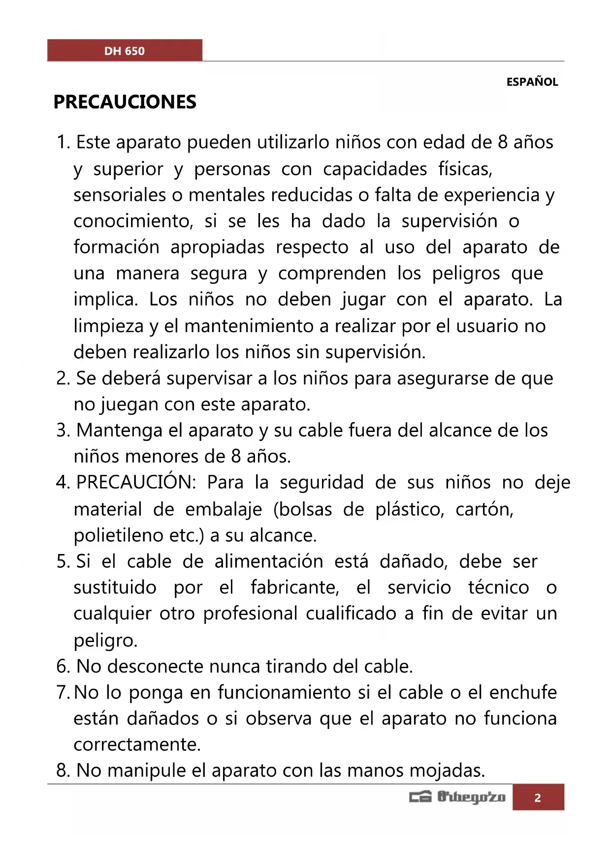 MANUAL DE USUARIO DH 650 Orbegozo