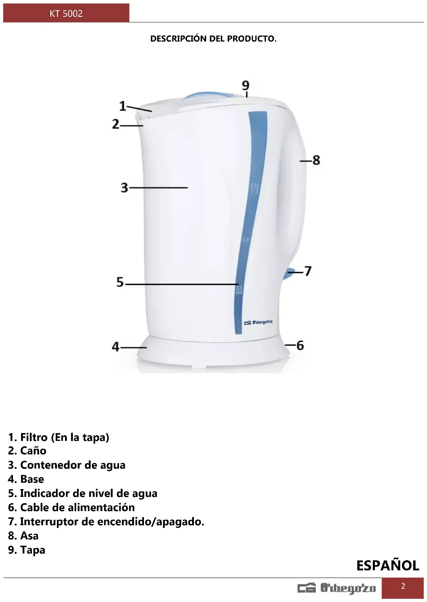 Descarga las instrucciones para tu Pava en formato PDF gratis! Encuentra tus instrucciones KT 5002 - Orbegozo y toma tu dispositivo electrónico nuevamente en la mano. En esta página están publicados todos los documentos necesarios para el uso de su dispositivo. KT 5002 de la marca Orbegozo.