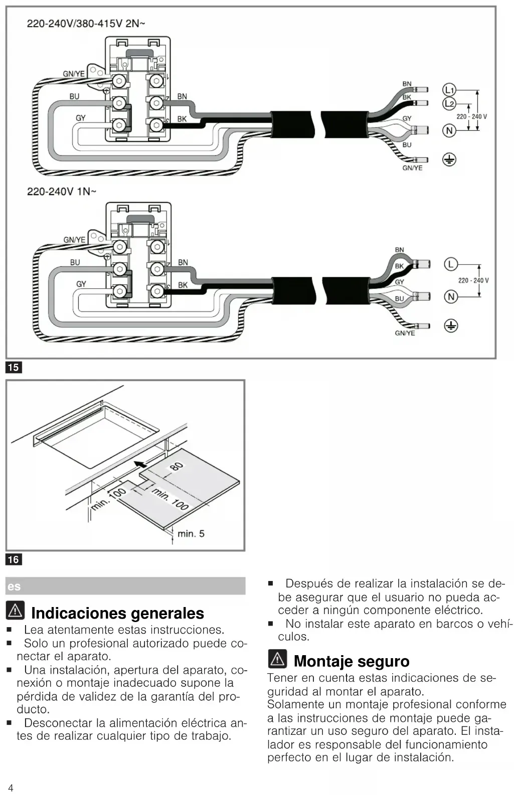 Indicaciones generales ¡ Lea atentamente estas instrucciones. ¡ Solo un profesional autorizado puede co- nectar el aparato. ¡ Una instalación, apertura del aparato, co- nexión o montaje inadecuado supone la pérdida de validez de la garantía del pro- ducto. ¡ Desconectar la alimentación eléctrica an- tes de realizar cualquier tipo de trabajo. ¡ Después de realizar la instalación se de- be asegurar que el usuario no pueda ac- ceder a ningún componente eléctrico. ¡ No instalar este aparato en barcos o vehí- culos. Montaje seguro Tener en cuenta estas indicaciones de se- guridad al montar el aparato. Solamente un montaje profesional conforme a las instrucciones de montaje puede ga- rantizar un uso seguro del aparato. El insta- lador es responsable del funcionamiento perfecto en el lugar de instalación.5 ADVERTENCIA‒¡Peligro: magnetismo! El aparato contiene imanes permanentes. Estos pueden repercutir en el correcto fun- cionamiento de implantes electrónicos co- mo marcapasos o bombas de insulina. ▶ Las personas con implantes electrónicos deberán mantener una distancia mínima de 10cm respecto al aparato. ADVERTENCIA‒¡Riesgo de lesiones! Las piezas que estén accesibles durante el montaje pueden tener los bordes afilados o causar cortes al tocarlas. ▶ Usar guantes de protección. Los productos químicos pueden ser peligro- sos. Para manipular los productos quími- cos, es necesario seguir las recomendacio- nes de los fabricantes de dichos productos. ▶ Llevar puesto el equipo de protección. Indicaciones relativas a la conexión eléctrica Para conectar electricamente el aparato de forma segura, consultar estas indicaciones. ¡ Sólo un profesional autorizado o un técnico del Servicio de Asistencia con formación específica puede conectar el aparato. Se tendrá que regir por las disposiciones de la compañía abastecedo- ra de la electricidad de la zona. ¡ El aparato debe ser conectado a la instalación fija y deben ser incorporados medios de desconexión a la instalación fija de acuerdo a las reglamenta- ciones de la instalación. ¡ El fabricante no asume responsabilidad alguna por fallos de funcionamiento o posibles daños de- rivados de una mala instalación eléctrica. Tipo de conexión ¡ El aparato pertenece a la clase de protección 1. Por esta razón, solo puede utilizarse conectado a una conexión con conductor de toma a tierra. Cable de alimentación Puede estar conectado en la caja de conexión de la placa de cocción o suministrado con el aparato. ¡ Los datos de conexión necesarios están indica- dos en la placa de características y en los esque- mas de conexión. ¡ Utilizar únicamente el cable de conexión suminis- trado con el aparato o por el Servicio de Asisten- cia Técnica. En caso de necesitar un cable de mayor longitud contacte con el Servicio de Asis- tencia Técnica. Disponible hasta 2,20 m Indicaciones relativas al mueble de montaje ¡ Las placas de inducción solo pueden ser instala- das sobre cajón u hornos con ventilación forzada. Debajo de la placa de cocción no se pueden ins- talar frigoríficos, lavavajillas, hornos sin ventila- ción, lavadoras o secadoras. ¡ Asegurarse de que el mueble empotrado es resis- tente a una temperatura de 90 °C como mínimo. Encimera Siga las recomendaciones del fabricante de la enci- mera. ¡ Plana, horizontal, estable. ¡ La encimera donde se instale el aparato debe ser resistente a pesos de 60kg aprox. ¡ En encimeras finas utilizar un material de refuerzo resistente al calor y a la humedad. ¡ La planitud de la placa de cocción solo debe comprobarse una vez instalada en el hueco de encastre. Campana extractora ¡ La distancia mínima entre la campana extractora y la placa de cocción debe ser al menos la distan- cia indicada en las instrucciones de montaje de la campana de extracción. Preparación de los muebles de montaje