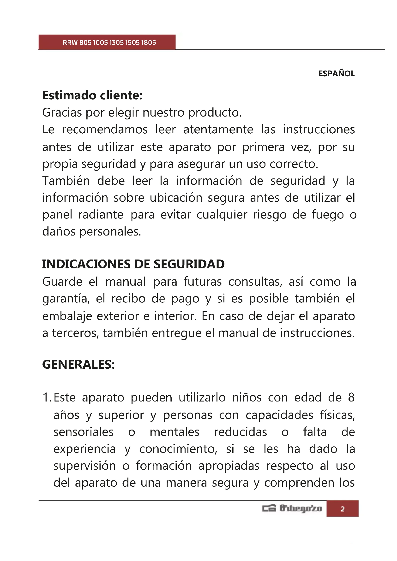 No usar este aparato de calefacción si se ha caído. No usar si hay señales visibles de daño al aparato de calefacción. Usar este aparato de calefacción sobre una superficie horizontal y estable, o fijarlo a la pared según sea aplicable. ADVERTENCIA: No utilice este aparato de calefacción en habitaciones pequeñas que estén ocupadas por personas que no puedan abandonar por si mismas la habitación, a menos que se proporcione vigilancia permanente. ADVERTENCIA: Para reducir el riesgo de fuego, mantenga los textiles, cortinas, u otro material inflamable a una distancia mínima de 1 m de la salida de aire.RRW 805 1005 1305 1505 1805