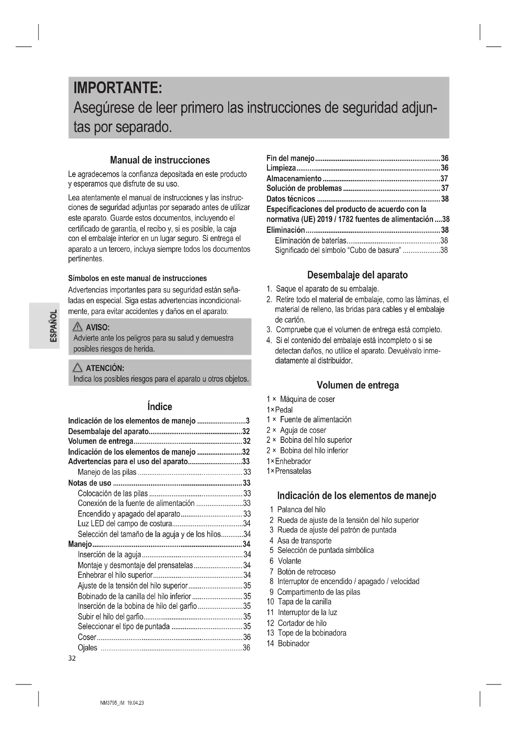 detectan daños, no utilice el aparato. Devuélvalo inme- diatamente al distribuidor. Volumen de entrega 1 × Máquina de coser 1 × Pedal 1 × Fuente de alimentación 2 × Aguja de coser 2 × Bobina del hilo superior 2 × Bobina del hilo inferior 1 × Enhebrador 1 × Prensatelas Indicación de los elementos de manejo 1 Palanca del hilo 2 Rueda de ajuste de la tensión del hilo superior 3 Rueda de ajuste del patrón de puntada 4 Asa de transporte 5 Selección de puntada simbólica 6 Volante 7 Botón de retroceso 8 Interruptor de encendido / apagado / velocidad 9 Compartimento de las pilas 10 Tapa de la canilla 11 Interruptor de la luz 12 Cortador de hilo 13 Tope de la bobinadora 14 BobinadorNM3795_IM 19.04.23