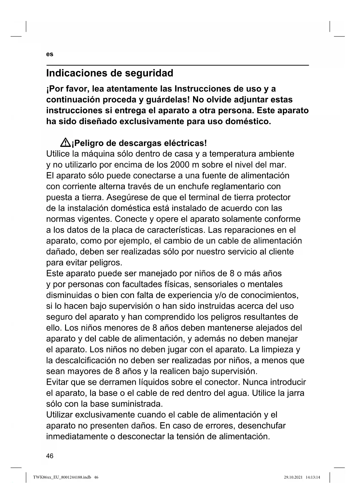 ADVERTENCIA: No usar el aparato cerca de bañeras, duchas, lavabos u otros recipientes que contengan agua. W¡Peligro de asxia! No deje que los niños jueguen con el embalaje. W¡Peligro de lesiones! Un uso erróneo del aparato puede causar lesiones. W¡Atención! ¡Limpieza de supercies en contacto con alimentos! Deben observarse las indicaciones de limpieza especiales de las instrucciones. TWK86xx_EU_8001244188.indb 46TWK86xx_EU_8001244188.indb 46 29.10.2021 14:13:1429.10.2021 14:13:1447