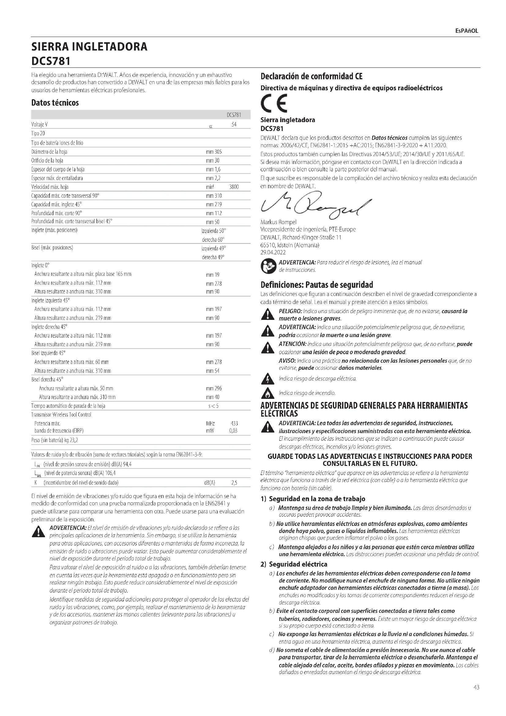 ADVERTENCIA: El nivel de emisión de vibraciones y/o ruido declarado se refiere a las principales aplicaciones de la herramienta. Sin embargo, si se utiliza la herramienta para otras aplicaciones, con accesorios diferentes o mantenidos de forma incorrecta, la emisión de ruido o vibraciones puede variar. Esto puede aumentar considerablemente el nivel de exposición durante el período total detrabajo. Para valorar el nivel de exposición al ruido o a las vibraciones, también deberían tenerse en cuenta las veces que la herramienta está apagada o en funcionamiento pero sin realizar ningún trabajo. Esto puede reducir considerablemente el nivel de exposición durante el periodo total detrabajo. Identifique medidas de seguridad adicionales para proteger al operador de los efectos del ruido y las vibraciones, como, por ejemplo, realizar el mantenimiento de la herramienta y de los accesorios, mantener las manos calientes (relevante para las vibraciones) u organizar patrones detrabajo. Declaración de conformidad CE Directiva de máquinas y directiva de equipos radioeléctricos Sierra ingletadora DCS781 DeWALT declara que los productos descritos en Datos técnicos cumplen las siguientes normas: 2006/42/CE, EN62841‑1:2015 +AC:2015; EN62841‑3‑9:2020 + A11:2020. Estos productos también cumplen las Directivas 2014/53/UE; 2014/30/UE y 2011/65/UE. Si desea más información, póngase en contacto con DeWALT en la dirección indicada a continuación o bien consulte la parte posterior delmanual. El que suscribe es responsable de la compilación del archivo técnico y realiza esta declaración en nombre deDeWALT. Markus Rompel Vicepresidente de ingeniería, PTE‑Europe DeWALT, Richard‑Klinger‑Straße 11 65510, Idstein (Alemania)