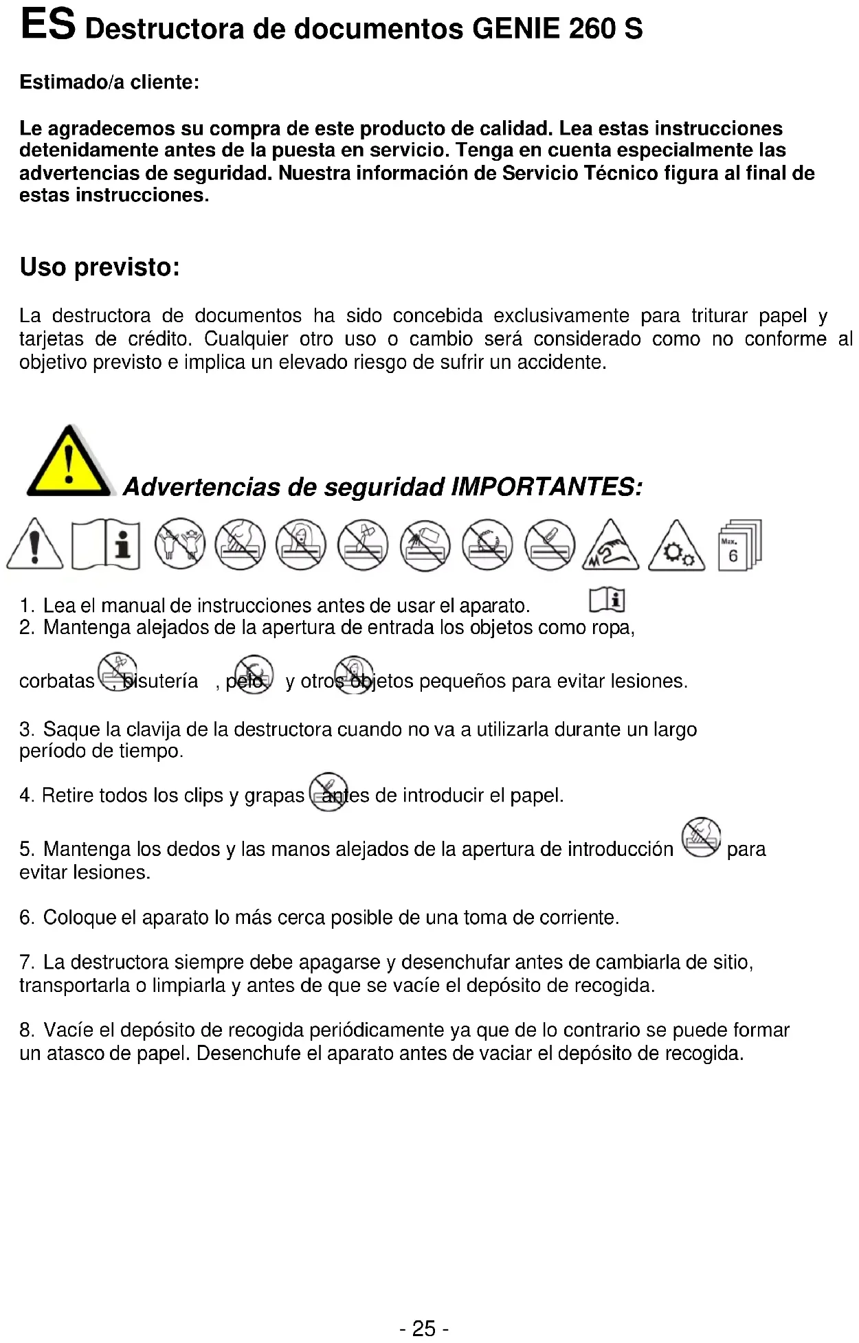 ES Destructora de documentos GENIE 260 S Estimado/a cliente: Le agradecemos su compra de este producto de calidad. Lea estas instrucciones detenidamente antes de la puesta en servicio. Tenga en cuenta especialmente las advertencias de seguridad. Nuestra información de Servicio Técnico figura al final de estas instrucciones.