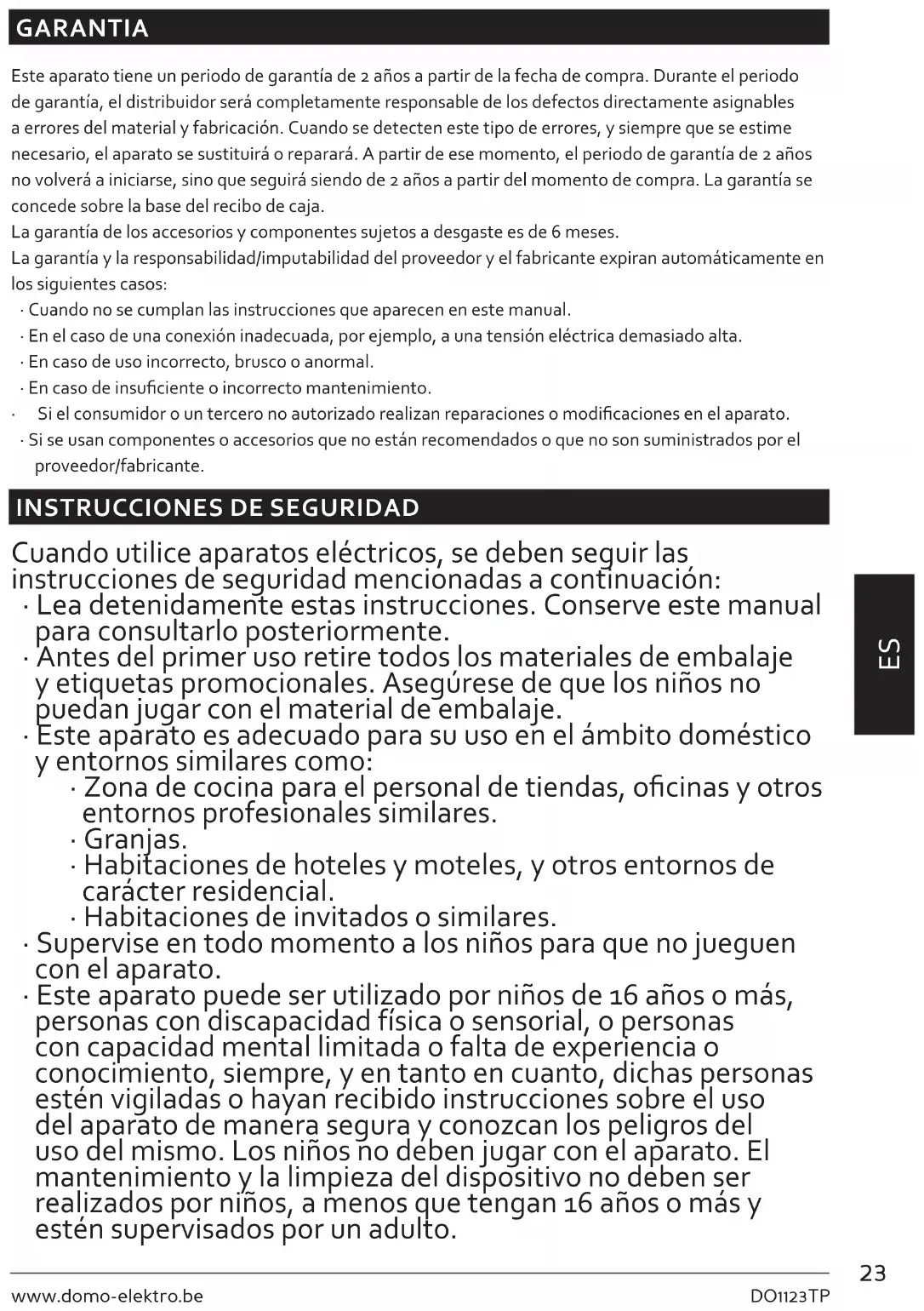 - Para protegerse de descargas eléctricas o quemaduras, no sumerja la unidad, el cable ni el enchufe en agua u otros líquidos.25 DO1123TP www.domo-elektro.be