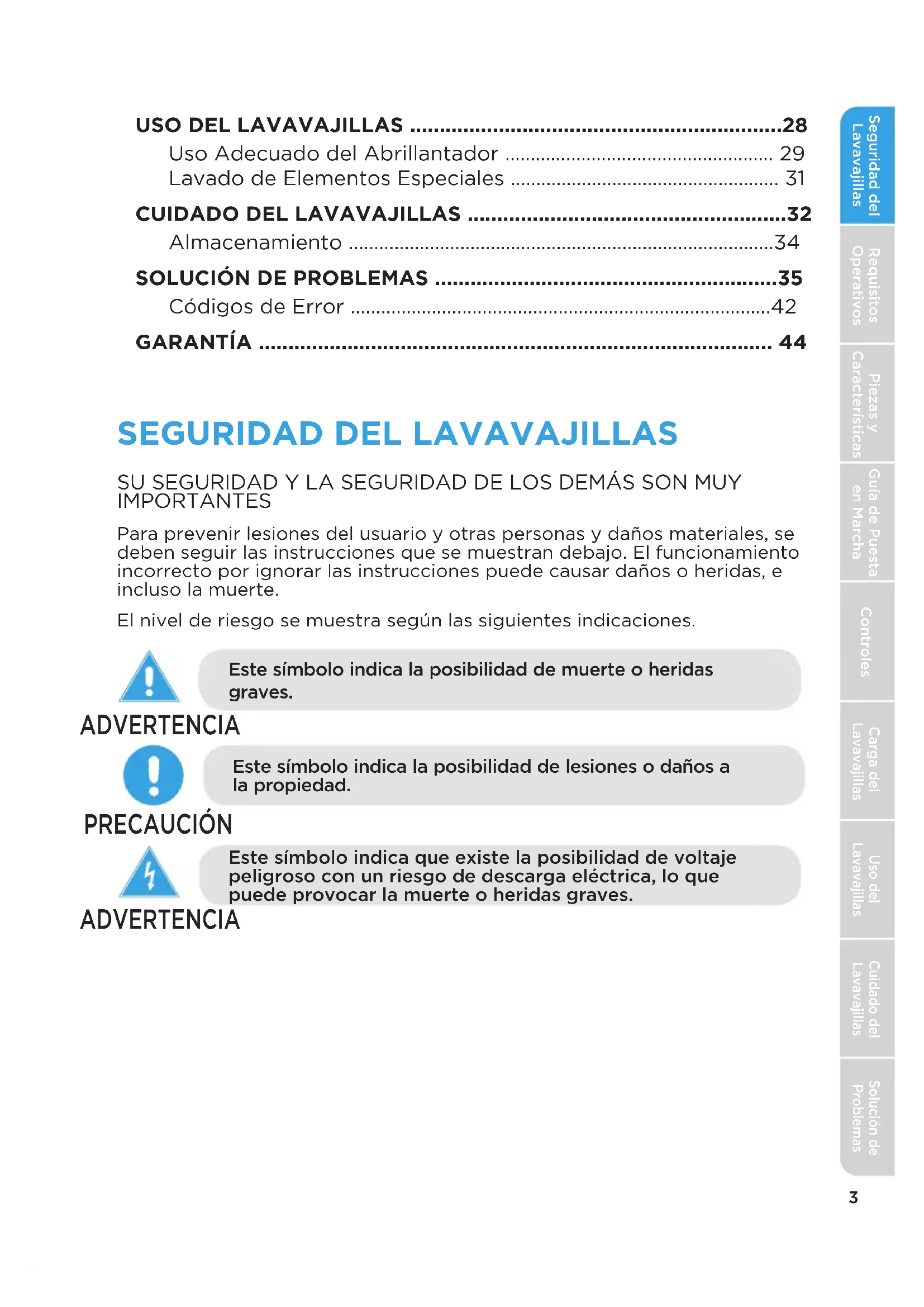 ADVERTENCIA5 Seguridad del LavavajillasRequisitos OperativosPiezas y CaracterísticasGuía de Puesta en Marcha ControlesCarga del LavavajillasUso del LavavajillasCuidado del LavavajillasSolución de Problemas