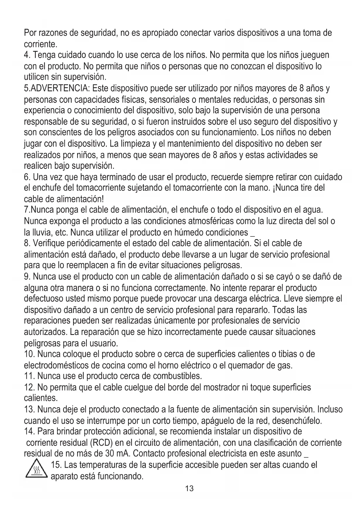 12. No permita que el cable cuelgue del borde del mostrador ni toque superficies