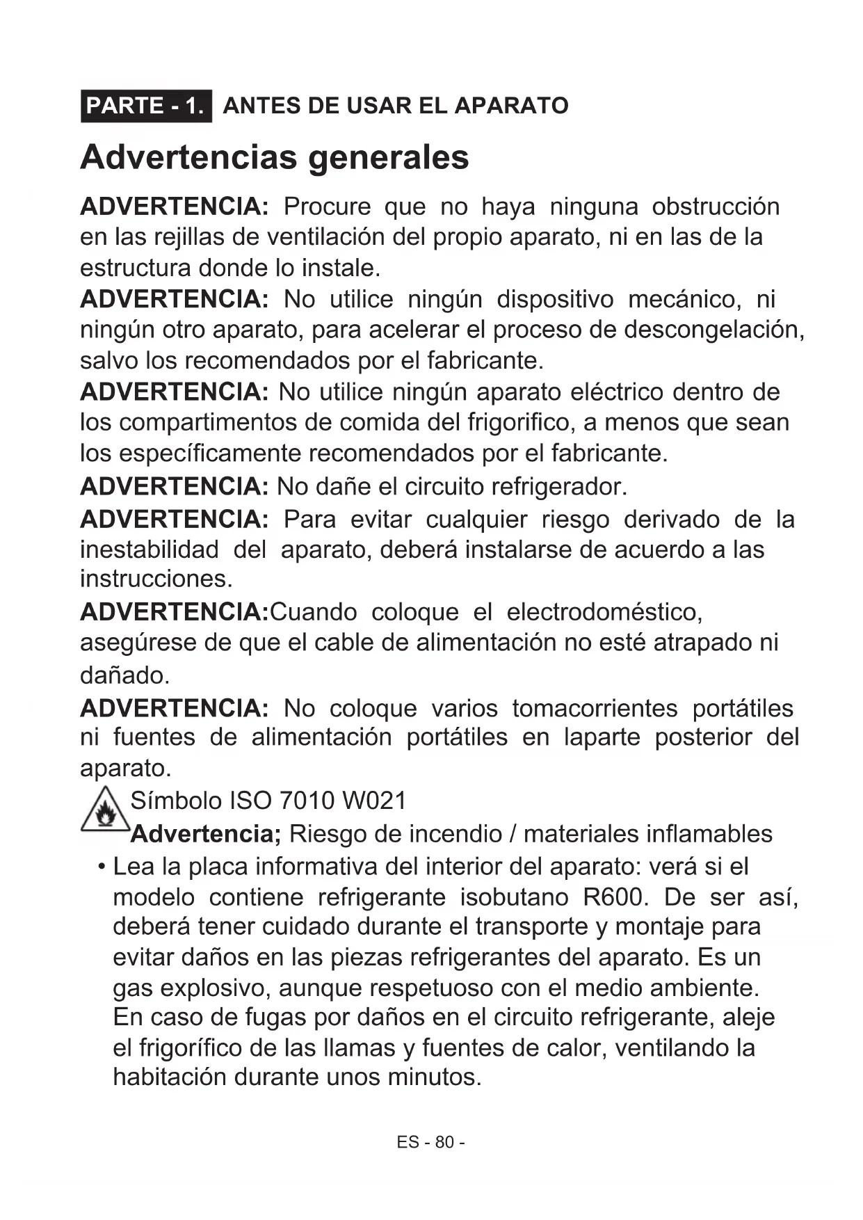 Consejos Para Ahorrar Energía .................................................................97 LOS COMPONENTES DEL APARATO Y COMPARTIMENTOS ............ 98ES - 80 - Advertencias generales ADVERTENCIA: Procure que no haya ninguna obstrucción en las rejillas de ventilación del propio aparato, ni en las de la estructura donde lo instale. ADVERTENCIA: No utilice ningún dispositivo mecánico, ni ningún otro aparato, para acelerar el proceso de descongelación, salvo los recomendados por el fabricante. ADVERTENCIA: No utilice ningún aparato eléctrico dentro de los compartimentos de comida del frigorico, a menos que sean los especícamente recomendados por el fabricante. ADVERTENCIA: No dañe el circuito refrigerador. ADVERTENCIA: Para evitar cualquier riesgo derivado de la inestabilidad del aparato, deberá instalarse de acuerdo a las instrucciones. ADVERTENCIA:Cuando coloque el electrodoméstico, asegúrese de que el cable de alimentación no esté atrapado ni dañado. ADVERTENCIA: No coloque varios tomacorrientes portátiles ni fuentes de alimentación portátiles en laparte posterior del aparato. Símbolo ISO 7010 W021 Advertencia; Riesgo de incendio / materiales inamables