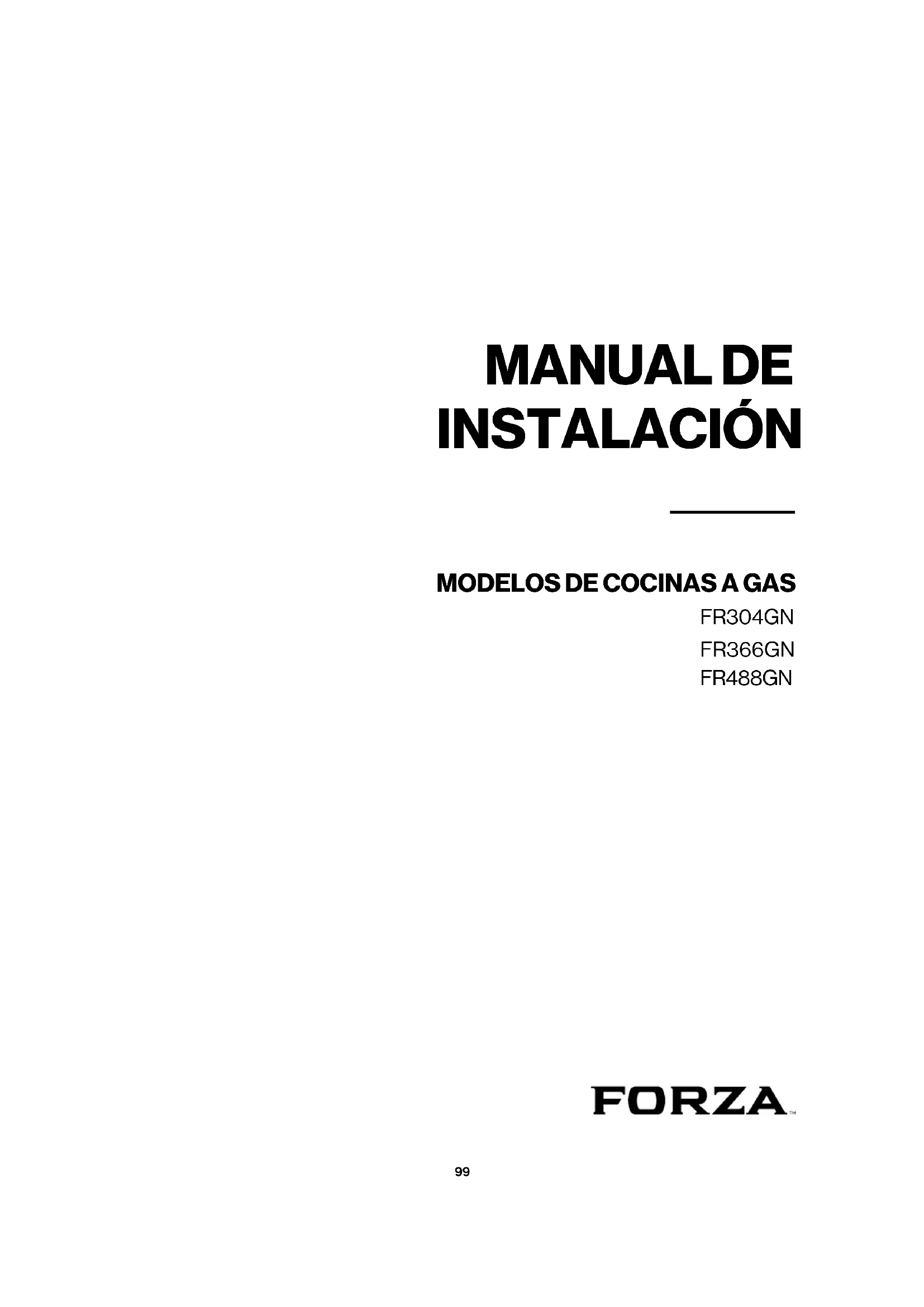 FR304GN FR366GN FR488GN100 ¡Enhorabuena por su reciente compra Forza! Antes de usar su nuevo producto Forza, se ruega dedicar un momento a examinar el Manual de Instalación. Encontrará las respuestas a todas sus preguntas, así como información de seguridad muy importante. Preste especial atención a las Instrucciones de seguridad importantes ubicadas al principio del manual. ¡Su producto Forza está listo y esperando para ser utilizado en su próxima creación gourmet! Table of Contents 101 Instrucciones de seguridad 104 Requisitos de ventilación 104 Preparación del armario 109 Desembalaje, Montaje y Desplazamiento de la cocina 110 Desembalaje de la cocina 116 Instalación del dispositivo antivuelco 119 Requisitos del gas 123 Requisitos eléctricos 125 Elevación de la cocina 126 Prueba de los Quemadores de la parte superior de la cocina 127 Adaptación del dispositivo para uso con gas LP 130 Adaptación del dispositivo para uso con gas Natural 137 Ajuste de la llama a fuego bajo 140 Instrucciones para el ajuste de la altitud 142 Datos técnicos 145 Lista de control del instalador Este dispositivo Forza se ha fabricado en Módena, Italia por GlemGas S.p.A., una empresa familiar. www.forzacucina.com101