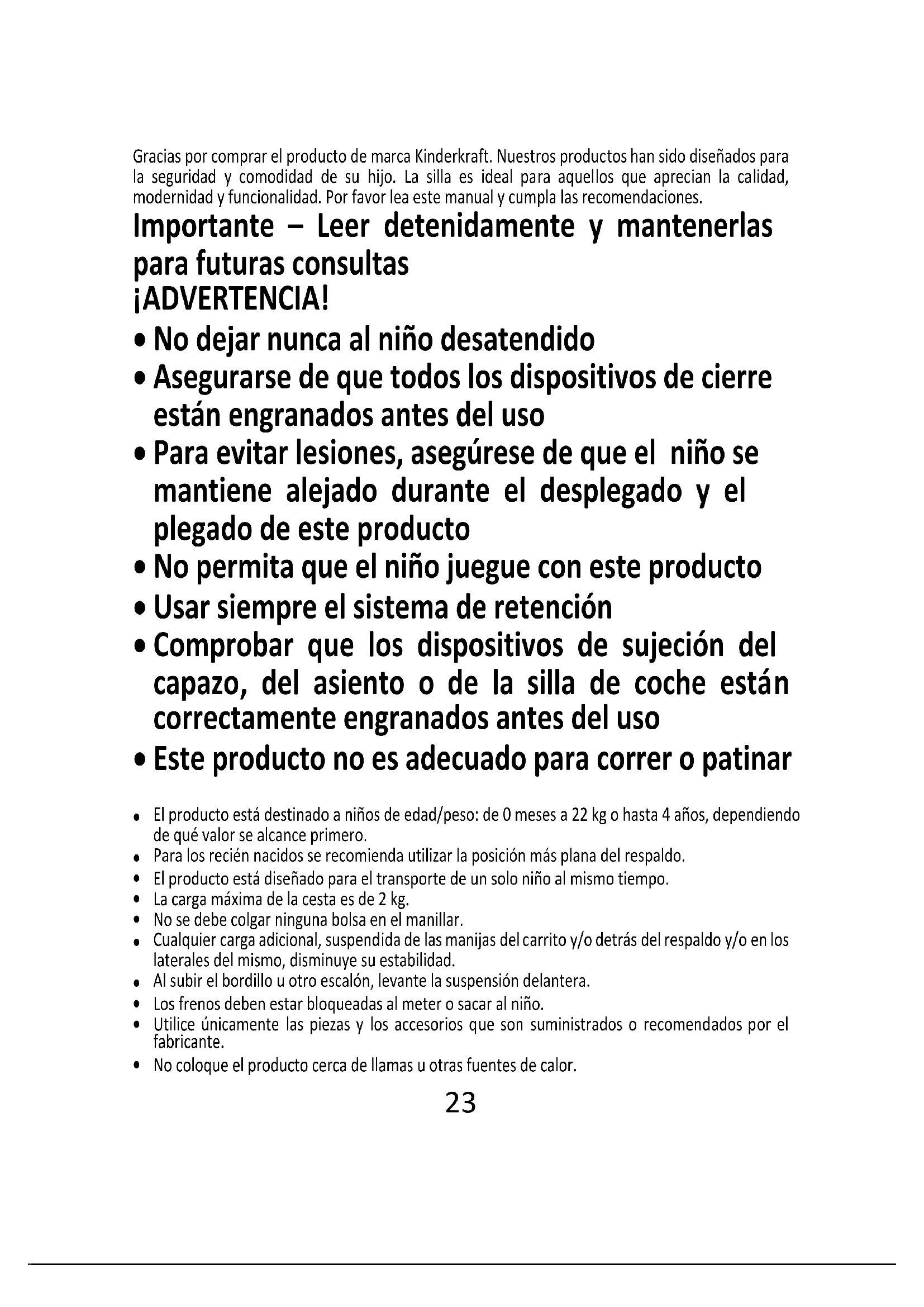 The full text of the Terms and Conditions of the Warranty is available on the website WWW.KINDERKRAFT.COM Estimado Cliente!23 Gracias por comprar el producto de marca Kinderkraft. Nuestros productos han sido diseñados para la seguridad y comodidad de su hijo. La silla es ideal para aquellos que aprecian la calidad, modernidad y funcionalidad. Por favor lea este manual y cumpla las recomendaciones. Importante – Leer detenidamente y mantenerlas para futuras consultas ¡ADVERTENCIA!