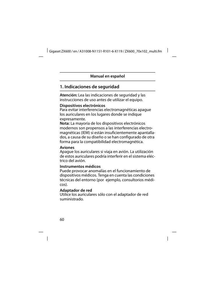 Gigaset ZX600 / en / A31008-N1151-R101-6-X119 / ZX600_70x102_multi.fm Conservación Se aconseja que deposite los auriculares en un lugar seguro donde no se puedan doblar ni aplastar. De lo contrario, existe peligro de lesión para los usuarios. Reparación o servicio técnico Cualquier intento de modificación o de eliminación de partes de los auriculares invalidará la garantía. Instrucciones de seguridad adicionales Los auriculares pueden emitir tonos de gran volumen y frecuencia elevada. Someter sus oídos a estos tonos puede dar lugar a una pérdida de audición permanente. El volumen necesario depende de las condiciones en las que utilice el dispositivo. Lea y comprenda las precauciones de seguridad que se muestran a continuación antes de utilizar los auriculares. Antes de utilizar este producto, lleve a cabo los pasos siguientes: ◆ Ponga el volumen en un ajuste mínimo antes de colocarse los auriculares ◆ Póngase los auriculares y ajuste el volumen en un nivel que le resulte cómodo Mientras utiliza este producto: Mantenga siempre el volumen lo más bajo posible y evite utilizar los auriculares en un entorno ruidoso, en el que pueda tener tendencia a aumentar el volumen.