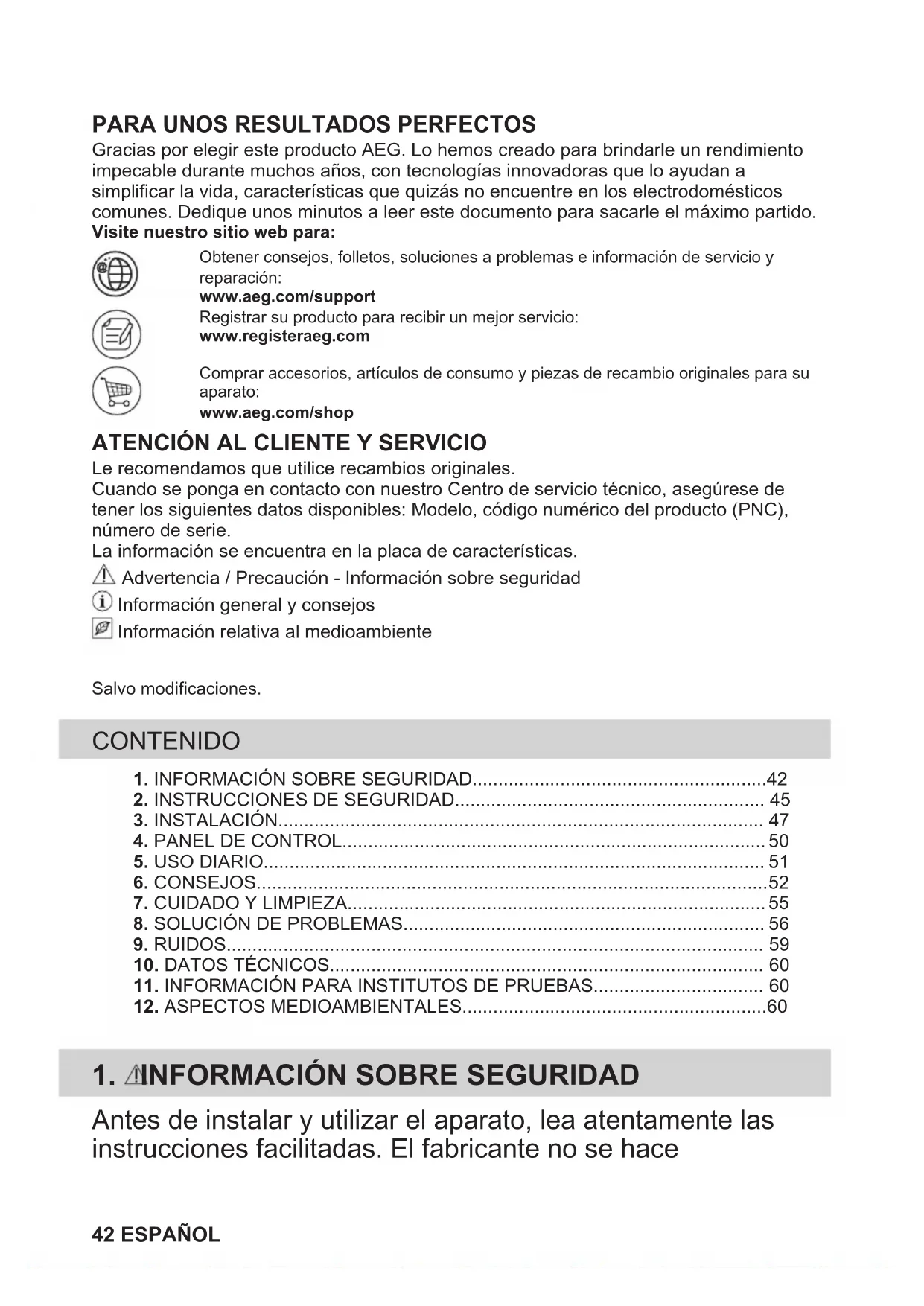 Gracias por elegir este producto AEG. Lo hemos creado para brindarle un rendimientoimpecable durante muchos años, con tecnologías innovadoras que lo ayudan asimplificar la vida, características que quizás no encuentre en los electrodomésticoscomunes. Dedique unos minutos a leer este documento para sacarle el máximo partido.Visite nuestro sitio web para:Obtener consejos, folletos, soluciones a problemas e información de servicio yreparación:www.aeg.com/supportRegistrar su producto para recibir un mejor servicio:www.registeraeg.comComprar accesorios, artículos de consumo y piezas de recambio originales para suaparato:www.aeg.com/shop