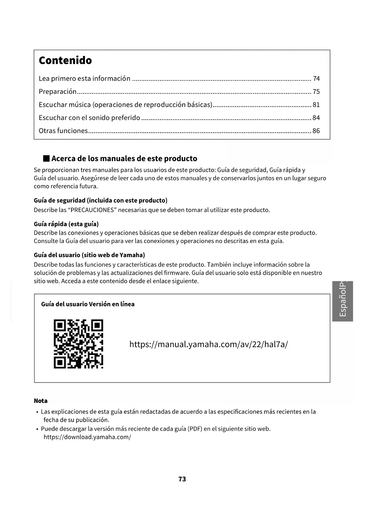 - Verifica della versione del firmware e inizializzazione del prodotto Altri argomenti non elencati sopra Funzione di aggiornamento del firmware Risoluzione dei problemi Specifiche Guida per l'utente Elenco dei menu di impostazioni 72■ Acerca de los manuales de este producto Se proporcionan tres manuales para los usuarios de este producto: Guía de seguridad, Guía rápida y Guía del usuario. Asegúrese de leer cada uno de estos manuales y de conservarlos juntos en un lugar seguro como referencia futura. Guía de seguridad (incluida con este producto) Describe las “PRECAUCIONES” necesarias que se deben tomar al utilizar este producto. Guía rápida (esta guía) Describe las conexiones y operaciones básicas que se deben realizar después de comprar este producto. Consulte la Guía del usuario para ver las conexiones y operaciones no descritas en esta guía. Guía del usuario (sitio web de Yamaha) Describe todas las funciones y características de este producto. También incluye información sobre la solución de problemas y las actualizaciones del firmware. Guía del usuario solo está disponible en nuestro sitio web. Acceda a este contenido desde el enlace siguiente. Guía del usuario Versión en línea https://manual.yamaha.com/av/22/hal7a/ Nota