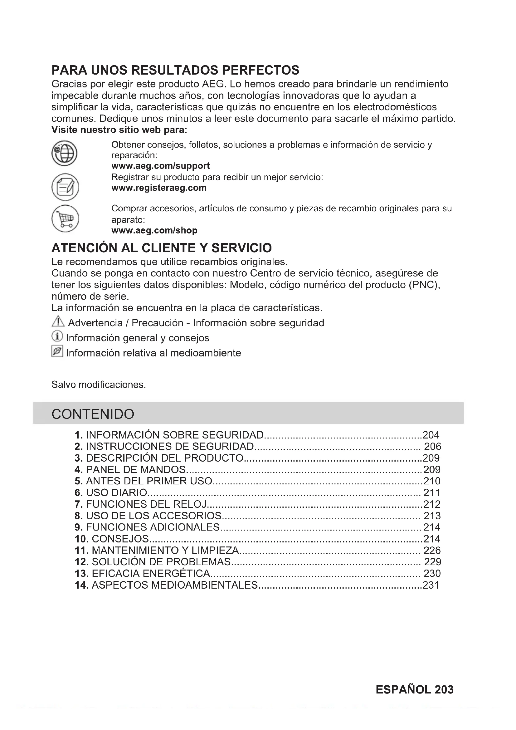 Le recomendamos que utilice recambios originales. Cuando se ponga en contacto con nuestro Centro de servicio técnico, asegúrese de tener los siguientes datos disponibles: Modelo, código numérico del producto (PNC), número de serie. La información se encuentra en la placa de características. Advertencia / Precaución - Información sobre seguridad Información general y consejos Información relativa al medioambiente Salvo modificaciones. CONTENIDO