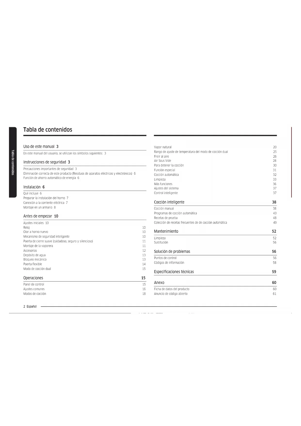 Horno empotrable Manual del usuario y de instalación NV7B564**** / NV7B565**** / NV7B566**** / NV7B567**** / NV7B568**** / NV7B564**C* / NV7B566**C* / NV7B568**C* / NV7B574**** / NV7B575**** / NV7B576**** / NV7B577**** / NV7B578****2 Español Tabla de contenidos Tabla de contenidos Uso de este manual 3 En este manual del usuario, se utilizan los símbolos siguientes: 3 Instrucciones de seguridad 3 Precauciones importantes de seguridad 3 Eliminación correcta de este producto (Residuos de aparatos eléctricos y electrónicos) 6 Función de ahorro automático de energía 6 Instalación 6 Qué incluye 6 Preparar la instalación del horno 7 Conexión a la corriente eléctrica 7 Montaje en un armario 8 Antes de empezar 10 Ajustes iniciales 10 Reloj 10 Olor a horno nuevo 10 Mecanismo de seguridad inteligente 10 Puerta de cierre suave (cuidadoso, seguro y silencioso) 11 Montaje de la vaporera 11 Accesorios 12 Depósito de agua 13 Bloqueo mecánico 13 Puerta exible 14 Modo de cocción dual 15 Operaciones 15 Panel de control 15 Ajustes comunes 16 Modos de cocción 18 Vapor natural 20 Rango de ajuste de temperatura del modo de cocción dual 25 Freír al aire 26 Air Sous Vide 28 Para detener la cocción 30 Función especial 31 Cocción automática 32 Limpieza 33 Más funciones 36 Ajustes del sistema 37 Control inteligente 37 Cocción inteligente 38 Cocción manual 38 Programas de cocción automática 43 Recetas de prueba 48 Colección de recetas frecuentes de de cocción automática 49 Mantenimiento 52 Limpieza 52 Sustitución 56 Solución de problemas 56 Puntos de control 56 Códigos de información 58 Especicaciones técnicas 59 Anexo 60 Ficha de datos del producto 60 Anuncio de código abierto 61Español 3 Uso de este manual Uso de este manual Gracias por elegir un horno empotrable SAMSUNG. Este manual del usuario contiene información de seguridad importante e instrucciones cuyo propósito es ayudar al usuario a hacer funcionar y a realizar el mantenimiento del electrodoméstico. Antes de usar el horno, lea atentamente el presente manual del usuario y guárdelo para consultas posteriores. En este manual del usuario, se utilizan los símbolos siguientes: ADVERTENCIA Riesgos o prácticas no seguras que pueden provocar lesiones graves, muerte o daños materiales. PRECAUCIÓN Riesgos o prácticas no seguras que pueden provocar lesiones o daños materiales. NOTA Información, consejos y recomendaciones útiles que ayudan a los usuarios a utilizar el producto. Instrucciones de seguridad La instalación de este horno la debe realizar únicamente un técnico electricista autorizado. El instalador es el responsable de la conexión del electrodoméstico a la corriente eléctrica, de acuerdo con las recomendaciones de seguridad pertinentes.