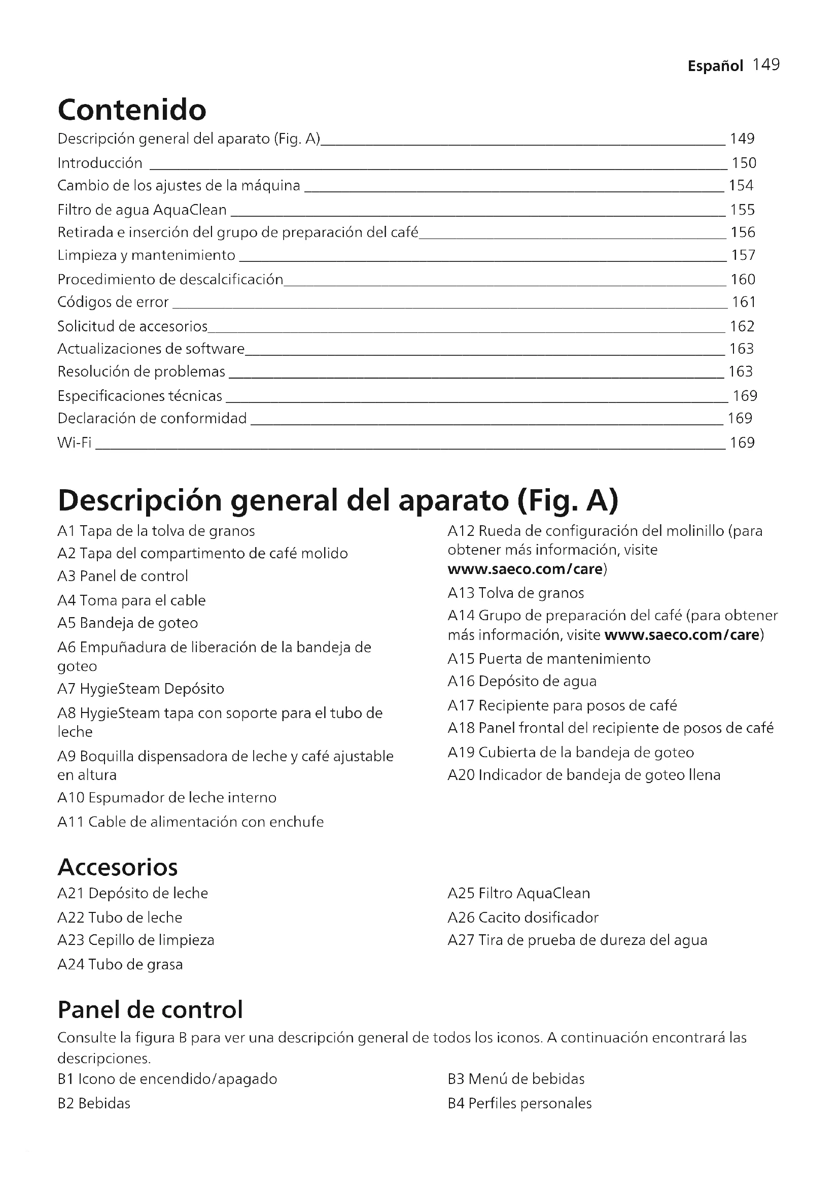 Español Contenido Descripción general del aparato (Fig. A)______________________________________________________ 149 Introducción _____________________________________________________________________________ 150 Cambio de los ajustes de la máquina ________________________________________________________ 154 Filtro de agua AquaClean __________________________________________________________________ 155 Retirada e inserción del grupo de preparación del café_________________________________________ 156 Limpieza y mantenimiento _________________________________________________________________ 157 Procedimiento de descalcificación___________________________________________________________ 160 Códigos de error __________________________________________________________________________ 161 Solicitud de accesorios_____________________________________________________________________ 162 Actualizaciones de software________________________________________________________________ 163 Resolución de problemas __________________________________________________________________ 163 Especificaciones técnicas ___________________________________________________________________ 169 Declaración de conformidad _______________________________________________________________ 169 Wi-Fi ____________________________________________________________________________________ 169 Descripción general del aparato (Fig. A) A1 Tapa de la tolva de granos A2 Tapa del compartimento de café molido A3 Panel de control A4 Toma para el cable A5 Bandeja de goteo A6 Empuñadura de liberación de la bandeja de goteo A7 HygieSteam Depósito A8 HygieSteam tapa con soporte para el tubo de leche A9 Boquilla dispensadora de leche y café ajustable en altura A10 Espumador de leche interno A11 Cable de alimentación con enchufe A12 Rueda de configuración del molinillo (para obtener más información, visite www.saeco.com/care) A13 Tolva de granos A14 Grupo de preparación del café (para obtener más información, visite www.saeco.com/care) A15 Puerta de mantenimiento A16 Depósito de agua A17 Recipiente para posos de café A18 Panel frontal del recipiente de posos de café A19 Cubierta de la bandeja de goteo A20 Indicador de bandeja de goteo llena Accesorios A21 Depósito de leche A22 Tubo de leche A23 Cepillo de limpieza A24 Tubo de grasa A25 Filtro AquaClean A26 Cacito dosificador A27 Tira de prueba de dureza del agua Panel de control Consulte la figura B para ver una descripción general de todos los iconos. A continuación encontrará las descripciones. B1 Icono de encendido/apagado B2 Bebidas B3 Menú de bebidas B4 Perfiles personales150 Español B5 Configuración de la máquina B6 Menú de estados B7 Tienda B8 Icono de inicio/parada Introducción Enhorabuena por la adquisición de una cafetera totalmente automática Saeco. Para disfrutar de todas las ventajas que ofrece la asistencia en línea de Saeco, utilice el panel de control para registrar su máquina mediante la conexión Wi-Fi integrada o bien vaya a www.saeco.com/MyCoffeeMachine y registre su producto allí. Lea atentamente el librillo de seguridad separado antes de usar la máquina por primera vez y consérvelo por si necesitara consultarlo en el futuro. La cafetera totalmente automática Saeco le permite conectarse a la red Wi-Fi para mejorar su experiencia al disfrutar del café. Al conectar su máquina a la red Wi-Fi, podrá: