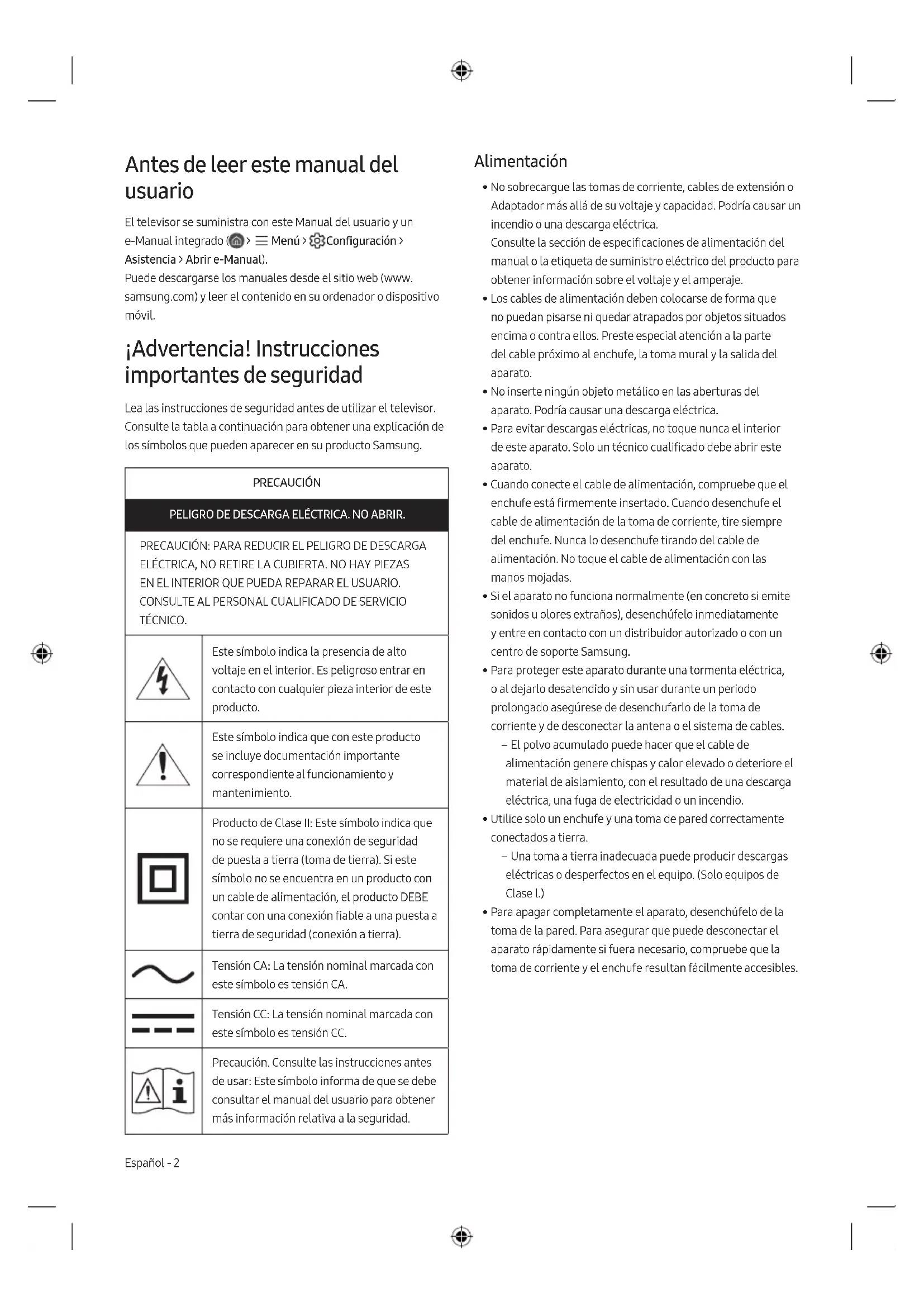- Para apagar completamente el aparato, desenchúfelo de la toma de la pared. Para asegurar que puede desconectar el aparato rápidamente si fuera necesario, compruebe que la toma de corriente y el enchufe resultan fácilmente accesibles. Antes de leer este manual del usuario El televisor se suministra con este Manual del usuario y un e-Manual integrado ( > Menú > Configuración > Asistencia > Abrir e-Manual). Puede descargarse los manuales desde el sitio web (www. samsung.com) y leer el contenido en su ordenador o dispositivo móvil. ¡Advertencia! Instrucciones importantes de seguridad Lea las instrucciones de seguridad antes de utilizar el televisor. Consulte la tabla a continuación para obtener una explicación de los símbolos que pueden aparecer en su producto Samsung. PRECAUCIÓN PELIGRO DE DESCARGA ELÉCTRICA. NO ABRIR. PRECAUCIÓN: PARA REDUCIR EL PELIGRO DE DESCARGA ELÉCTRICA, NO RETIRE LA CUBIERTA. NO HAY PIEZAS EN EL INTERIOR QUE PUEDA REPARAR EL USUARIO.