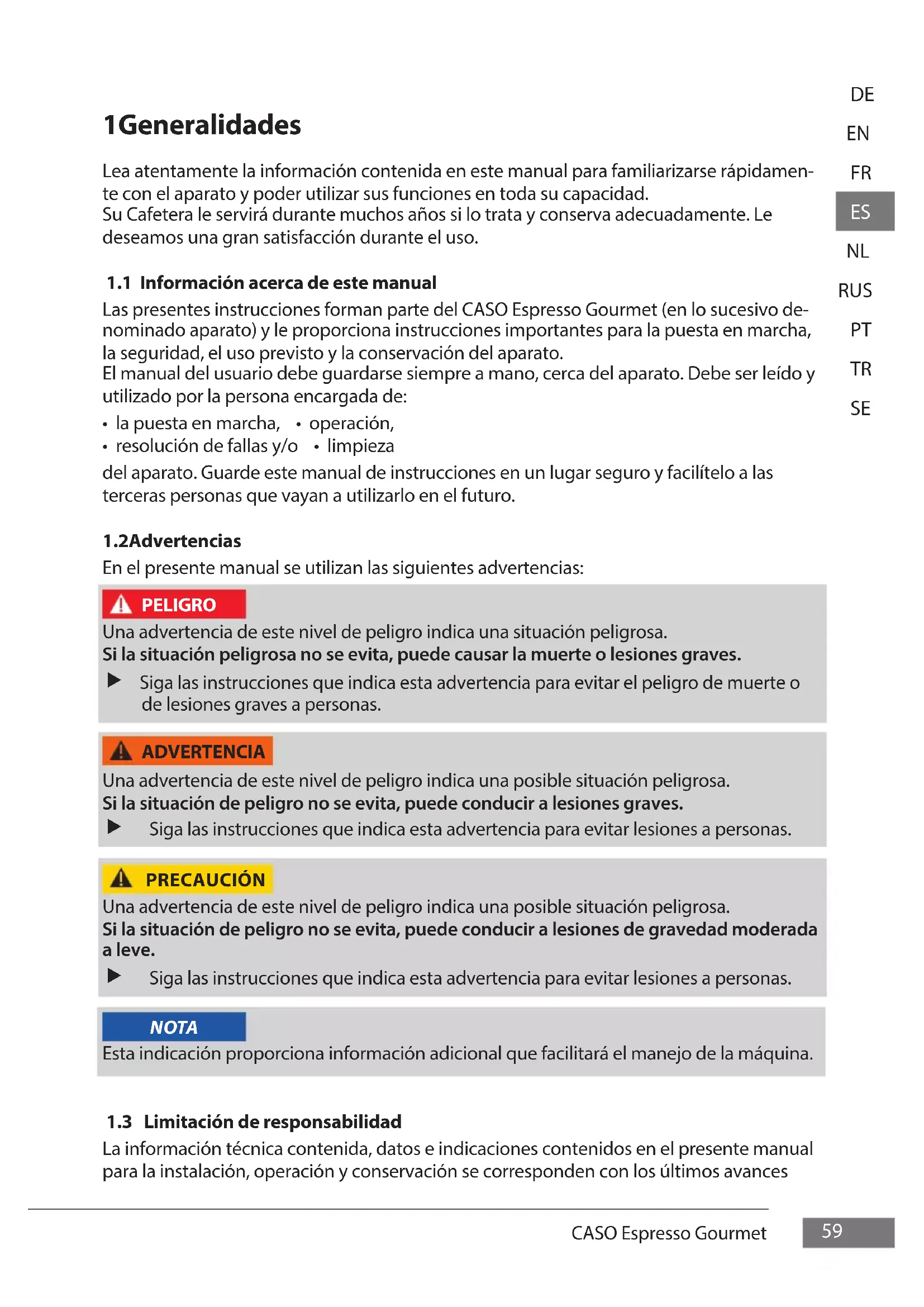 - En pensiones con desayuno Cualquier otro uso distinto al aquí previsto se considera un uso indebido del aparato. ADVERTENCIA Peligro ante el uso no conforme a lo previsto. El uso indebido del aparato o cualquier uso distinto al uso previsto pue- de entrañar peligro.61 CASO Espresso Gourmet