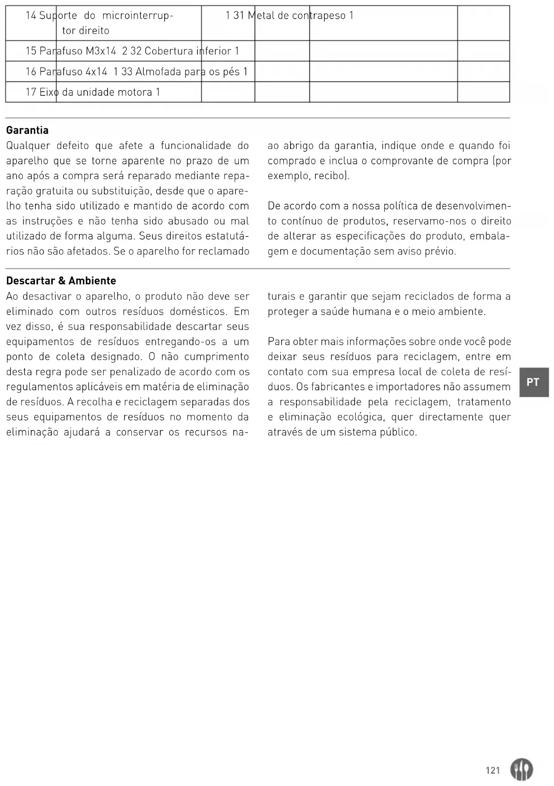 15 Tornillo M3x14 2 32 Cubierta inferior 1 16 Tornillo 4x14 1 33 Almohadilla para pies 1 17 Eje de la unidad motriz 1 Garantía Cualquier defecto que afecte a la funcionalidad del aparato que se manifieste en el plazo de un año a partir de la compra será reparado mediante reparación o sustitución gratuita, siempre que el aparato haya sido utilizado y mantenido de acuer- do con las instrucciones y no haya sido abusado o utilizado indebidamente de ninguna manera. Sus derechos legales no se ven afectados. Si el aparato se reclama bajo garantía, indique dónde y cuándo se compró e incluya un comprobante de compra (por ejemplo, recibo). En línea con nuestra política de desarrollo conti- nuo de productos, nos reservamos el derecho de cambiar las especificaciones del producto, el em- balaje y la documentación sin previo aviso. Descartar y Medio Ambiente Al retirar el aparato, el producto no debe eliminar- se con otros residuos domésticos. En su lugar, es su responsabilidad deshacerse de su equipo de residuos entregándolo a un punto de recogida de- signado. El incumplimiento de esta norma puede ser penalizado de conformidad con la normativa aplicable en materia de eliminación de residuos. La recogida y reciclaje por separado de sus equi- pos de residuos en el momento de su eliminación ayudará a conservar los recursos naturales y ga- rantizar que se reciclen de manera que proteja la salud humana y el medio ambiente. Para obtener más información sobre dónde puede dejar sus residuos para su reciclaje, póngase en contacto con su empresa local de recogida de re- siduos. Los fabricantes e importadores no se res- ponsabilizan del reciclaje, el tratamiento y la elimi- nación ecológica, ya sea directamente o a través de un sistema público.129