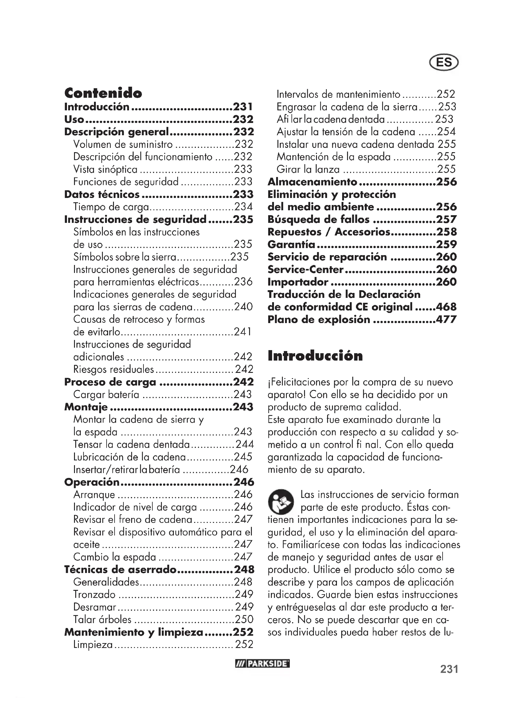 bricante en o dentro del aparato. Esto no es ningún defecto y no supone ningún mo- tivo de preocupación. Uso La motosierra a batería ha sido diseñada exclusivamente para serrar madera. Este aparato no está previsto para otros usos (por ejemplo, corte de mampostería, plásti- cos o alimentos). Este aparato forma parte de la Serie ( Parkside) X20VTEAM, y puede utili- zarse con baterías de la serie ( Parkside) X20VTEAM. Las baterías solo pueden cargarse con cargadores de la serie ( Parkside) X20VTEAM. La sierra eléctrica de cadena fue diseñada sólo para cortar madera. No está prevista para todos los demás fi nes de uso (p.ej. el corte de albañilería, plástico o alimentos). La sierra de cadena está destinada al área de bricolaje. No fue concebida para el uso profesional permanente. El equipo está destinado para el uso por personal adulto. El uso de la sierra de cadena está permi- tido sólo bajo vigilancia a adolescentes mayores de 16 años. El fabricante no se responsabiliza por daños causados por el uso contrario al previsto o por operación incorrecta. Este aparato no es idóneo para fi nes profesionales.En caso de uso profe- sional, se extingue la garantía. Esta electrosierra de cadena puede ser utilizada sólo por una persona y sólo para cortar madera. La sierra de cadena tiene que ser sostenida con la mano de- recha por la empuñadura posterior y con la mano izquierda por la empuñadura delantera. Antes de utilizar la sierra de cadena, el usuario tiene que haber leído y entendido todas las indicaciones e instruc- ciones contenidas en el manual de uso. El usuario tiene que llevar un equipamiento de protección personal (EPP). Con la sierra de cadena sólo se puede cortar madera. ¡No está permitido cortar materiales como p. ej. plástico, piedra, metal o madera que contenga cuerpos extraños (p. ej. clavos o tornillos)! Descripción general En las páginas desplegables encontrará imágenes de los com- ponentes más importantes. Volumen de suministro Desembale el aparato y compruebe que esté completo: - Motosierra recargable (ya montado) - Portador protector de cuchilla (ya montado) - Botella de aceite con 180ml aceite biol. para cadena - Instrucciones de uso La batería y el cargador no están incluidos. Evacue el material de embalaje de una forma conveniente. Descripción del funcionamiento La motosierra a batería está equipada con un sistema de tensado rápido de cadenas. La cadena de la sierra giratoria pasa so- bre una lanza (carril guía). La lubricación permanente de la cadena se consigue mediante un dispositivo de aceite. Para proteger al usuario, el aparato cuenta con diferentes dispositivos de protección. En la siguiente descripción encontrará la función de los elementos de operación.233