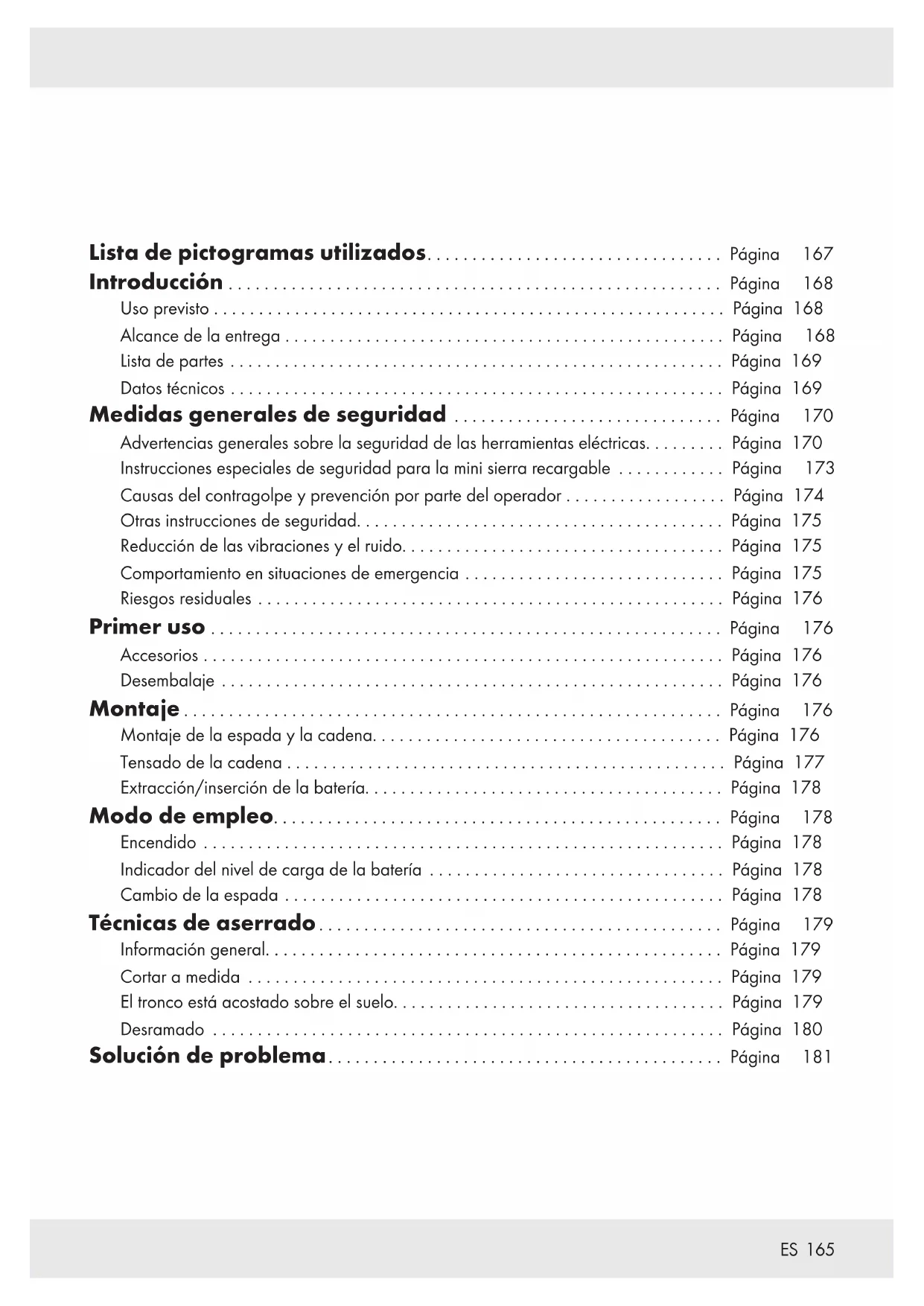 Lista de pictogramas utilizados................................. Página 167 Introducción ....................................................... Página 168 Uso previsto ......................................................... Página 168 Alcance de la entrega ................................................. Página 168 Lista de partes ....................................................... Página 169 Datos técnicos ....................................................... Página 169 Medidas generales de seguridad .............................. Página 170 Advertencias generales sobre la seguridad de las herramientas eléctricas......... Página 170 Instrucciones especiales de seguridad para la mini sierra recargable ............ Página 173 Causas del contragolpe y prevención por parte del operador .................. Página 174 Otras instrucciones de seguridad......................................... Página 175 Reducción de las vibraciones y el ruido.................................... Página 175 Comportamiento en situaciones de emergencia ............................. Página 175 Riesgos residuales .................................................... Página 176 Primer uso ......................................................... Página 176 Accesorios .......................................................... Página 176 Desembalaje ........................................................ Página 176 Montaje ............................................................ Página 176 Montaje de la espada y la cadena....................................... Página 176 Tensado de la cadena ................................................. Página 177 Extracción/inserción de la batería........................................ Página 178 Modo de empleo.................................................. Página 178 Encendido .......................................................... Página 178 Indicador del nivel de carga de la batería ................................. Página 178 Cambio de la espada ................................................. Página 178 Técnicas de aserrado............................................. Página 179 Información general................................................... Página 179 Cortar a medida ..................................................... Página 179 El tronco está acostado sobre el suelo..................................... Página 179 Desramado ......................................................... Página 180 Solución de problema............................................ Página 181166