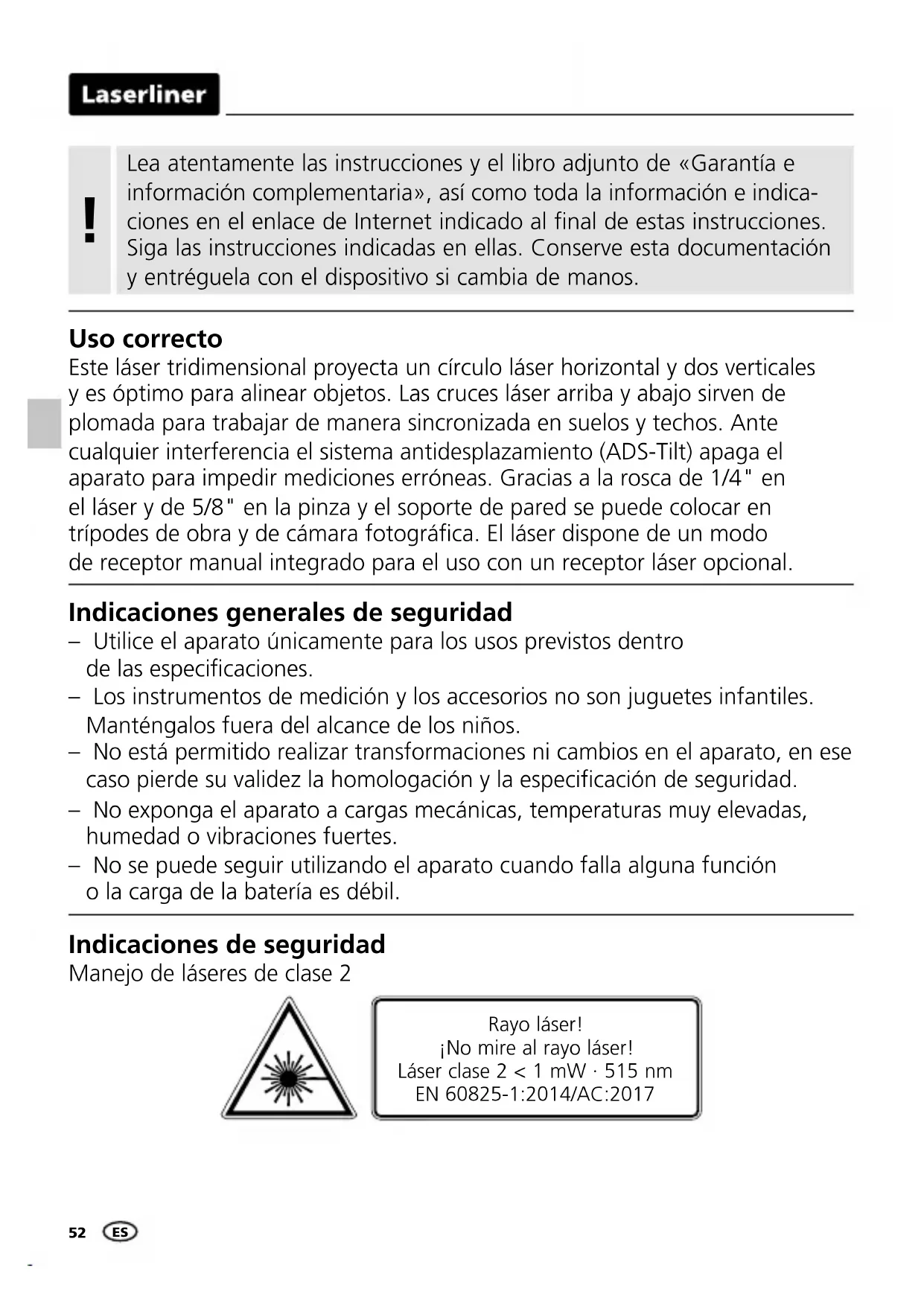Indicaciones generales de seguridad – Utilice el aparato únicamente para los usos previstos dentro de las especicaciones. – Los instrumentos de medición y los accesorios no son juguetes infantiles. Manténgalos fuera del alcance de los niños. – No está permitido realizar transformaciones ni cambios en el aparato, en ese caso pierde su validez la homologación y la especicación de seguridad. – No exponga el aparato a cargas mecánicas, temperaturas muy elevadas, humedad o vibraciones fuertes. – No se puede seguir utilizando el aparato cuando falla alguna función o la carga de la batería es débil. Rayo láser! ¡No mire al rayo láser! Láser clase 2 < 1 mW · 515 nm EN 60825-1:2014/AC:2017 Indicaciones de seguridad Manejo de láseres de clase 2 Uso correcto Este láser tridimensional proyecta un círculo láser horizontal y dos verticales y es óptimo para alinear objetos. Las cruces láser arriba y abajo sirven de plomada para trabajar de manera sincronizada en suelos y techos. Ante cualquier interferencia el sistema antidesplazamiento (ADS-Tilt) apaga el aparato para impedir mediciones erróneas. Gracias a la rosca de 1/4" en el láser y de 5/8" en la pinza y el soporte de pared se puede colocar en trípodes de obra y de cámara fotográca. El láser dispone de un modo de receptor manual integrado para el uso con un receptor láser opcional. ESMasterPlane-Laser 3G