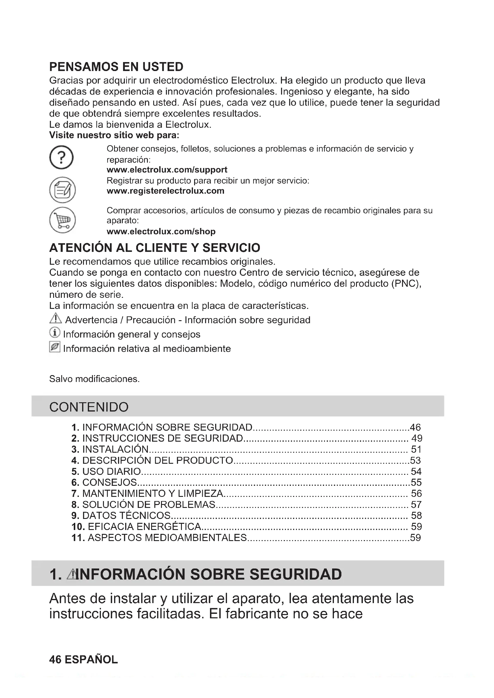 Le recomendamos que utilice recambios originales.Cuando se ponga en contacto con nuestro Centro de servicio técnico, asegúrese detener los siguientes datos disponibles: Modelo, código numérico del producto (PNC),número de serie.La información se encuentra en la placa de características. Advertencia / Precaución - Información sobre seguridad Información general y consejos Información relativa al medioambienteSalvo modificaciones. CONTENIDO 1. INFORMACIÓN SOBRE SEGURIDAD.........................................................462. INSTRUCCIONES DE SEGURIDAD............................................................ 49