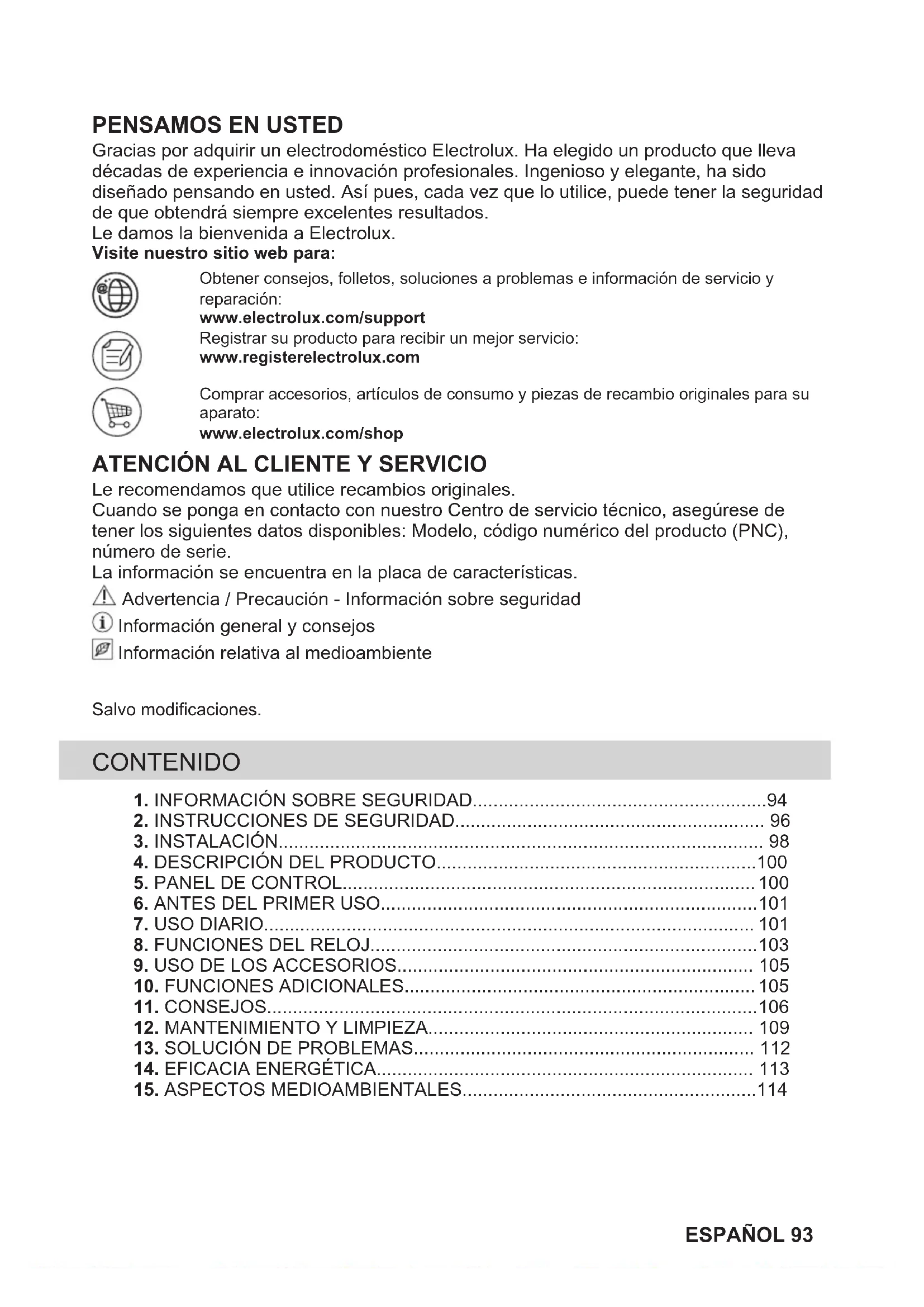 Gracias por adquirir un electrodoméstico Electrolux. Ha elegido un producto que lleva décadas de experiencia e innovación profesionales. Ingenioso y elegante, ha sido diseñado pensando en usted. Así pues, cada vez que lo utilice, puede tener la seguridad de que obtendrá siempre excelentes resultados. Le damos la bienvenida a Electrolux. Visite nuestro sitio web para: Obtener consejos, folletos, soluciones a problemas e información de servicio yreparación:www.electrolux.com/supportRegistrar su producto para recibir un mejor servicio:www.registerelectrolux.comComprar accesorios, artículos de consumo y piezas de recambio originales para suaparato:www.electrolux.com/shop