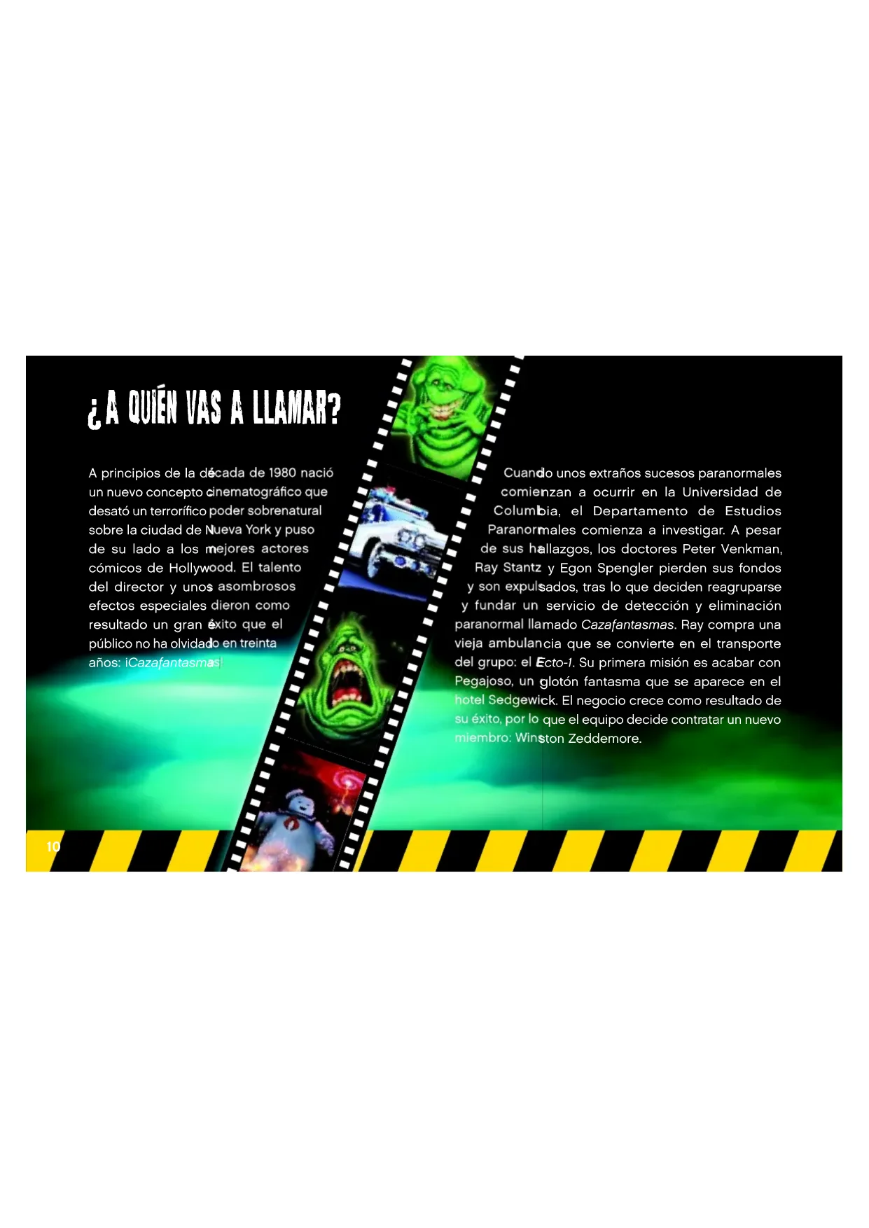 21108_V39_BI_6097686.indd 8 27/02/2014 2:40 PM9 21108_V39_BI_6097686.indd 9 24/02/2014 3:25 PMA principios de la década de 1980 nació un nuevo concepto cinematográfi co que desató un terrorífi co poder sobrenatural sobre la ciudad de Nueva York y puso de su lado a los mejores actores cómicos de Hollywood. El talento del director y unos asombrosos efectos especiales dieron como resultado un gran éxito que el público no ha olvidado en treinta años: ¡Cazafantasmas! Cuando unos extraños sucesos paranormales comienzan a ocurrir en la Universidad de Columbia, el Departamento de Estudios Paranormales comienza a investigar. A pesar de sus hallazgos, los doctores Peter Venkman, Ray Stantz y Egon Spengler pierden sus fondos y son expulsados, tras lo que deciden reagruparse y fundar un servicio de detección y eliminación paranormal llamado Cazafantasmas. Ray compra una vieja ambulancia que se convierte en el transporte del grupo: el Ecto-1. Su primera misión es acabar con Pegajoso, un glotón fantasma que se aparece en el hotel Sedgewick. El negocio crece como resultado de su éxito, por lo que el equipo decide contratar un nuevo miembro: Winston Zeddemore. A principios de la década de 1980 nació un nuevo concepto cinematográfi co que desató un terrorífi co poder sobrenatural sobre la ciudad de Nueva York y puso de su lado a los mejores actores cómicos de Hollywood. El talento del director y unos asombrosos efectos especiales dieron como resultado un gran éxito que el público no ha olvidado en treinta Cazafantasmas