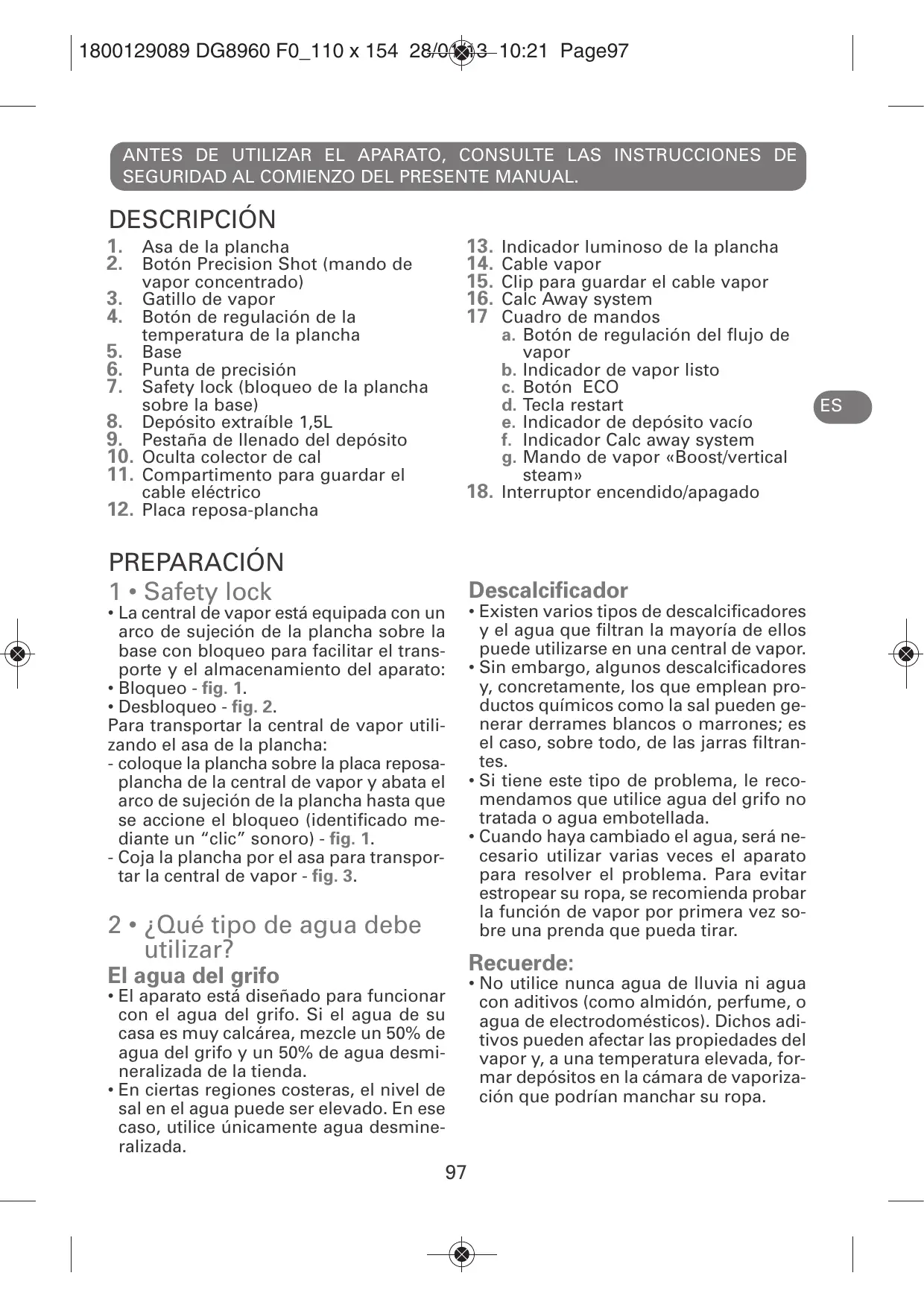- Desbloqueo - fig. 2. Para transportar la central de vapor utilizando el asa de la plancha: - coloque la plancha sobre la placa reposaplancha de la central de vapor y abata el arco de sujeción de la plancha hasta que se accione el bloqueo (identificado mediante un “clic” sonoro) - fig. 1. - Coja la plancha por el asa para transportar la central de vapor - fig. 3. 2 • ¿Qué tipo de agua debe utilizar? Descalcificador