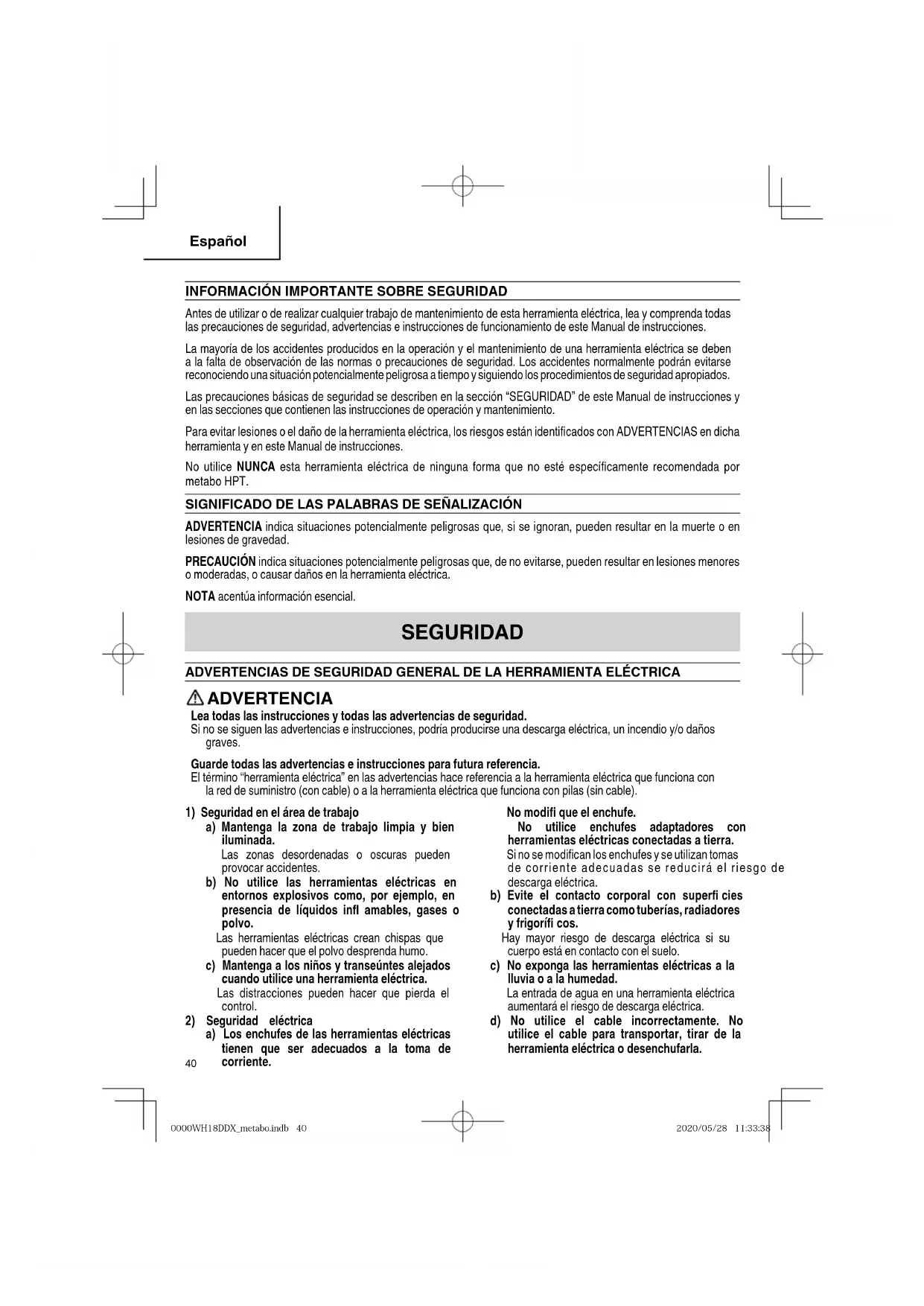 Français 0000WH18DDXmetabo.indb390000WH18DDXmetabo.indb39 2020/05/2811:33:382020/05/2811:33:38INFORMACIÓN IMPORTANTE SOBRE SEGURIDAD Antes de utilizar o de realizar cualquier trabajo de mantenimiento de esta herramienta eléctrica, lea y comprenda todas las precauciones de seguridad, advertencias e instrucciones de funcionamiento de este Manual de instrucciones. La mayoría de los accidentes producidos en la operación y el mantenimiento de una herramienta eléctrica se deben a la falta de observación de las normas o precauciones de seguridad. Los accidentes normalmente podrán evitarse reconociendo una situación potencialmente peligrosa a tiempo y siguiendo los procedimientos de seguridad apropiados. Las precauciones básicas de seguridad se describen en la sección “SEGURIDAD” de este Manual de instrucciones y en las secciones que contienen las instrucciones de operación y mantenimiento. Para evitar lesiones o el daño de la herramienta eléctrica, los riesgos están identifi cados con ADVERTENCIAS en dicha herramienta y en este Manual de instrucciones. No utilice NUNCA esta herramienta eléctrica de ninguna forma que no esté específi camente recomendada por metabo HPT. SIGNIFICADO DE LAS PALABRAS DE SEÑALIZACIÓN ADVERTENCIA indica situaciones potencialmente peligrosas que, si se ignoran, pueden resultar en la muerte o en lesiones de gravedad. PRECAUCIÓN indica situaciones potencialmente peligrosas que, de no evitarse, pueden resultar en lesiones menores o moderadas, o causar daños en la herramienta eléctrica. NOTA acentúa información esencial. SEGURIDAD ADVERTENCIAS DE SEGURIDAD GENERAL DE LA HERRAMIENTA ELÉCTRICA ADVERTENCIA Lea todas las instrucciones y todas las advertencias de seguridad. Si no se siguen las advertencias e instrucciones, podría producirse una descarga eléctrica, un incendio y/o daños graves. Guarde todas las advertencias e instrucciones para futura referencia. El término “herramienta eléctrica” en las advertencias hace referencia a la herramienta eléctrica que funciona con la red de suministro (con cable) o a la herramienta eléctrica que funciona con pilas (sin cable).