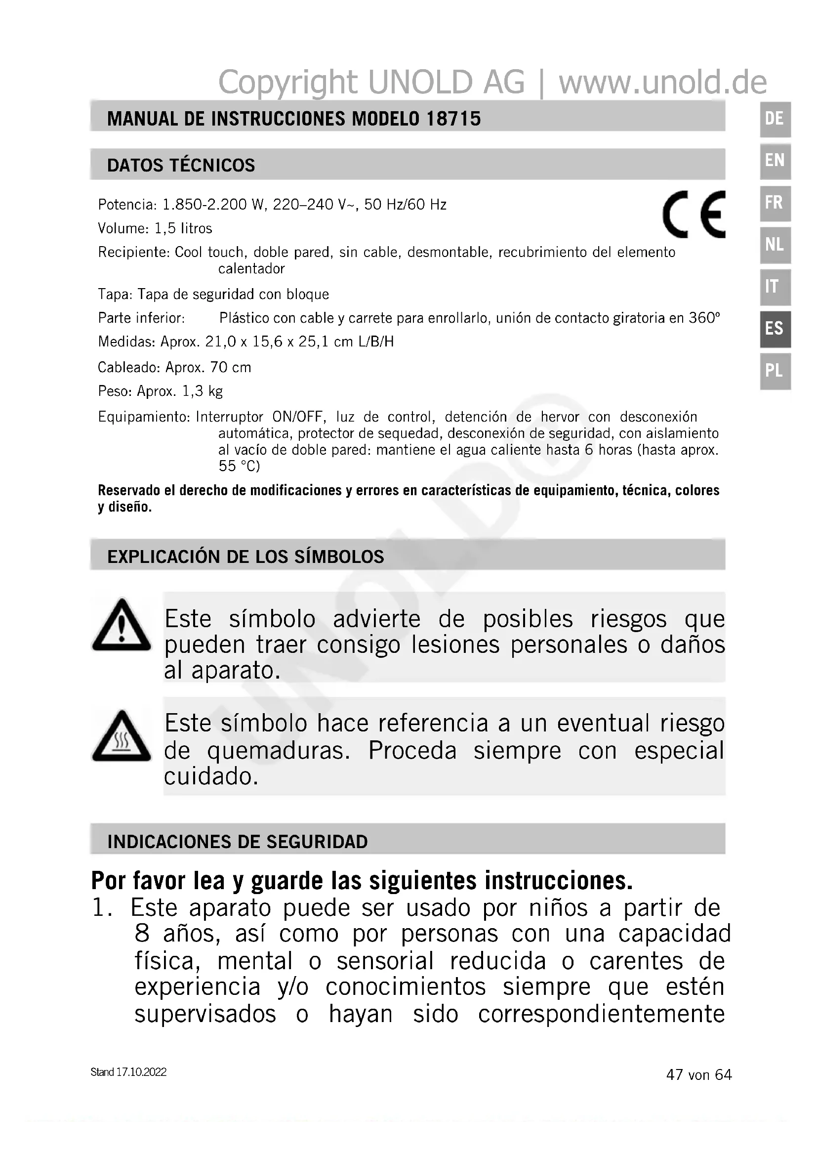 debe ser suministrado por el fabricante o su servicio o una persona cualificada del mismo modo que se va a sustituir, a fin de evitar peligros. PRECAUCIÓN: No abra la tapa mientras el agua esté hirviendo. Si el recipiente se llena por encima de su capacidad máxima, pueden producirse salpicaduras de agua hirviente. El equipo está muy caliente durante e inmediatamente después de su uso. De ninguna manera abra la carcasa del aparato. Existe peligro de una descarga eléctrica. Este aparato solo se puede utilizar con el zócalo suministrado. El fabricante no asume ninguna responsabilidad en caso de montaje defectuoso, uso inapropiado o inco- rrecto o después de reparaciones realizadas por terceros no autorizados. Copyright UNOLD AG | www.unold.de UNOLD®Stand 17.10.2022 51 von 64