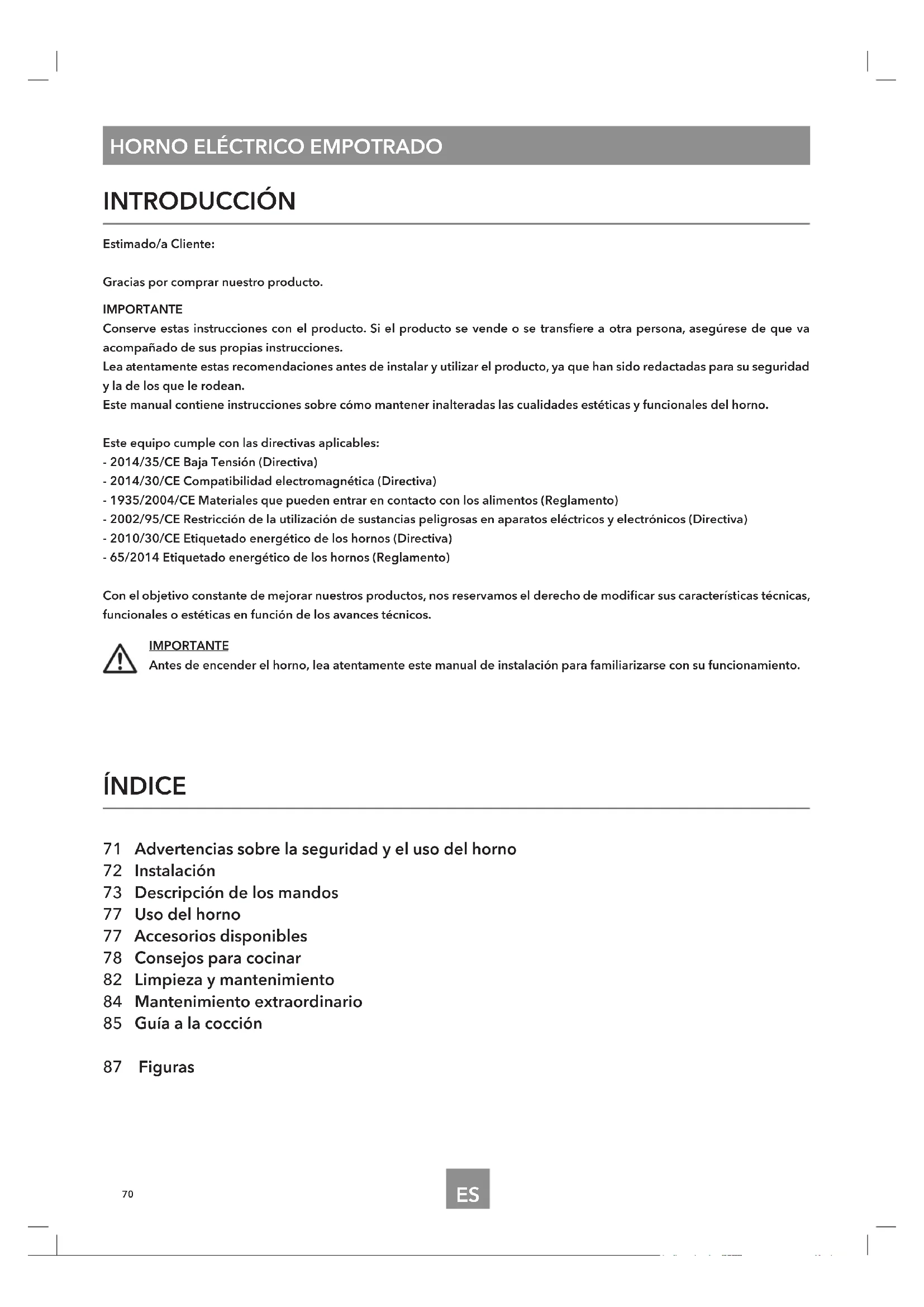 ÍNDICE 71 Advertencias sobre la seguridad y el uso del horno 72 Instalación 73 Descripción de los mandos 77 Uso del horno 77 Accesorios disponibles 78 Consejos para cocinar 82 Limpieza y mantenimiento 84 Mantenimiento extraordinario 85 Guía a la cocción 87 Figuras INTRODUCCIÓN Estimado/a Cliente: Gracias por comprar nuestro producto. IMPORTANTE Conserve estas instrucciones con el producto. Si el producto se vende o se transere a otra persona, asegúrese de que va acompañado de sus propias instrucciones. Lea atentamente estas recomendaciones antes de instalar y utilizar el producto, ya que han sido redactadas para su seguridad y la de los que le rodean. Este manual contiene instrucciones sobre cómo mantener inalteradas las cualidades estéticas y funcionales del horno. Este equipo cumple con las directivas aplicables: - 2014/35/CE Baja Tensión (Directiva) - 2014/30/CE Compatibilidad electromagnética (Directiva) - 1935/2004/CE Materiales que pueden entrar en contacto con los alimentos (Reglamento) - 2002/95/CE Restricción de la utilización de sustancias peligrosas en aparatos eléctricos y electrónicos (Directiva) - 2010/30/CE Etiquetado energético de los hornos (Directiva) - 65/2014 Etiquetado energético de los hornos (Reglamento) Con el objetivo constante de mejorar nuestros productos, nos reservamos el derecho de modicar sus características técnicas, funcionales o estéticas en función de los avances técnicos. IMPORTANTE Antes de encender el horno, lea atentamente este manual de instalación para familiarizarse con su funcionamiento.