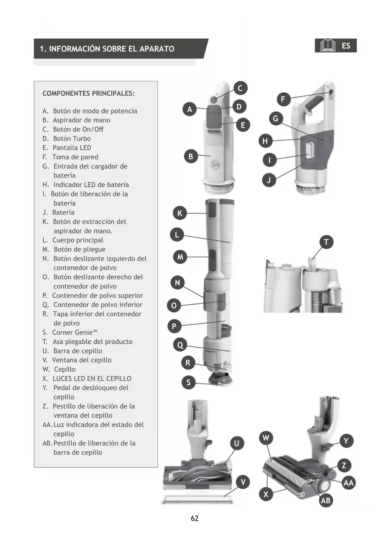 batería J. Batería K. Botón de extracción del aspirador de mano. L. Cuerpo principal M. Botón de pliegue N. Botón deslizante izquierdo del contenedor de polvo O. Botón deslizante derecho del contenedor de polvo P. Contenedor de polvo superior Q. Contenedor de polvo inferior R. Tapa inferior del contenedor de polvo S. Corner Genie™ T. Asa plegable del producto U. Barra de cepillo