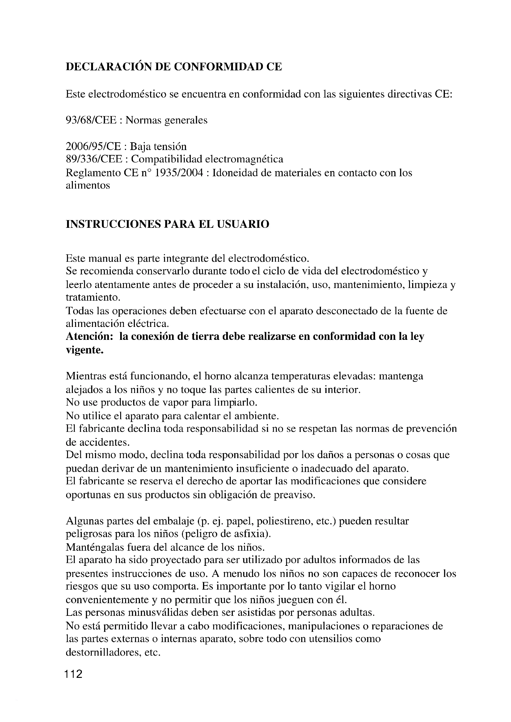 Este manual es parte integrante del electrodoméstico. Se recomienda conservarlo durante todo el ciclo de vida del electrodoméstico y leerlo atentamente antes de proceder a su instalación, uso, mantenimiento, limpieza y tratamiento. Todas las operaciones deben efectuarse con el aparato desconectado de la fuente de alimentación eléctrica. Atención: la conexión de tierra debe realizarse en conformidad con la ley vigente. Mientras está funcionando, el horno alcanza temperaturas elevadas: mantenga alejados a los niños y no toque las partes calientes de su interior. No use productos de vapor para limp iarlo. No utilice el aparato para calentar el ambiente. El fabricante declina toda responsabilidad si no se respetan las normas de prevención de accidentes. Del mismo modo, declina toda responsabilidad por los daños a personas o cosas que puedan derivar d e un mantenimiento insuficiente o inadecuado del aparato. El fabricante se reserva el derecho de aportar las modificaciones que considere oportunas en sus productos sin obligación de preaviso. Algunas partes del embalaje (p. ej. papel, poliestireno, etc.) pueden resultar peligrosas para los niños (peligro de asfixia). Manténgalas fuera del alcance de los niños. El aparato ha sido proyectado para ser utilizado por adultos informados de las prese ntes instrucciones de uso. A menudo los niños no son capaces de reconocer los riesgos que su uso comporta. Es importante por lo tanto vigilar el horno convenientemente y no permitir que los niños jueguen con él. Las personas minusválidas deben ser asistida s por personas adultas. No está permitido llevar a cabo modificaciones, manipulaciones o reparaciones de las partes externas o internas aparato, sobre todo con utensilios como destornilladores, etc. 112Las reparaciones, especialmente de las partes eléctricas, deben ser efectuadas exclusivamente por personal cualificado. Los arreglos inapropiados pueden provocar graves accidentes, dañar el aparato y el equipo y provocar un funcionamiento anómalo del mismo. Los aparatos reparados en los centros de asistencia deb en ser sometidos a las pruebas rutinarias de rigor, en particular a la prueba de continuidad del circuito de tierra. Este producto ha sido proyectado para un uso doméstico. El fabricante declina toda responsabilidad en caso de daños a personas o cosas